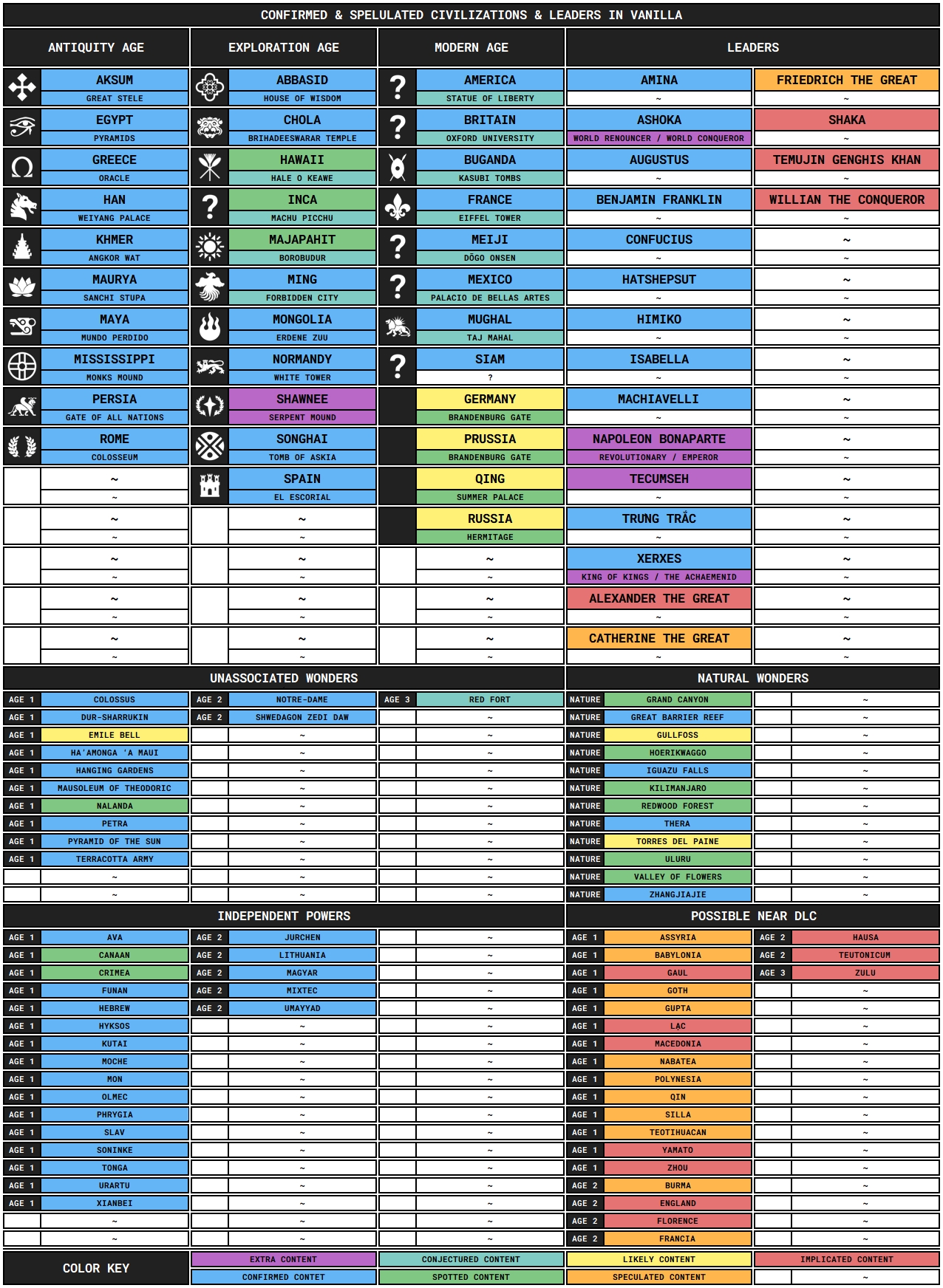 Gedemon patron-adjointTransactions (0) | On sait maintenant qu'il y aura 30+1 civilizations jouables à la sortie du jeu (trop peu AMHA, ça fait 10 joueurs max vu la répartition sur trois ages, et en général je joue avec beaucoup plus, j'vais vite modder ça --------------- [hommage au beau jeu] [Footware] |