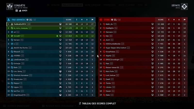 trollandco Do not feed the Troll !Transactions (10) | Depuis peu les parties sont de plus en plus déséquilibrées, on enchaîne les défaites en étant de loin meilleure escouade, en allant caper des points, en défendant les points de notre QG, ça commence quasiment toujours avec 200 pts d'avance et milieu de game on se retrouve à n'avoir que les flags capés par la squad pendant que rien n'est défendu en parallèle et ça se termine par une lose écrasante. Pourtant c'est pas faute d'y mettre du sang et de la sueur... J'ai l'impression que c'est le pire opus niveau implication des joueurs dans la victoire, ça attaque et ça défend mais à 50cm hors du point, ça s'allonge dans les recoins où jamais personne ne passe, en fait les mecs jouent au BR en CQ Message cité 3 fois Message édité par trollandco le 30-10-2025 à 22:57:23 --------------- [ACH] Jeux XBox One [VDS] Jeux Wii / Origin : TrollAndCo (Vidéos HFR BF1/BFV) |