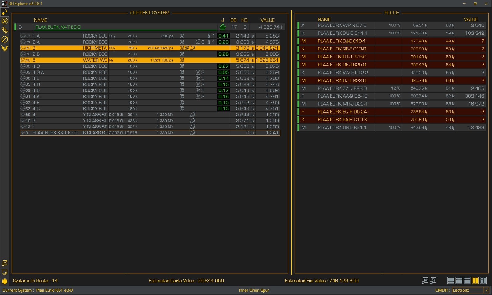 LEctrodz MaelleTransactions (0) | Perso, je vise le "Stratum Tectonicas", donc je sais à peu près en cours de route ce que je vais gagner. Et puis c'est assez simple dans mon cas car je pose mon Fleet Carrier à ~2000 LY de la bulle, donc j'ai un accès direct aux premières découvertes et je peux revendre en gros quand je veux (dans mon FC). J'ai pas à me demander si c'est assez, je fais des allers-retours sans être pénalisé par une partie du trajet qui serait dans la bulle.
