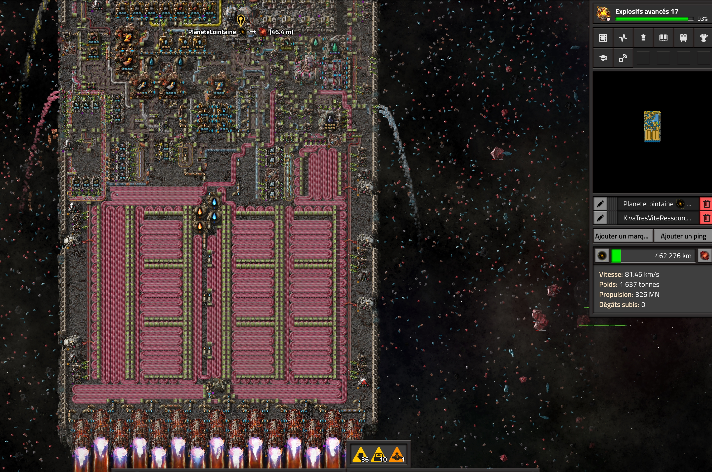 L'HdT Les beaufs c'est bienTransactions (2) | Ma question c'était plutôt pour la rapidité de collecte. En faisant des allers-retours donc en explosant des cailloux je pensais que ça augmentait drastiquement la vitesse de collecte. Mon idée était de faire Nauvis-autre planète en larguant toute la science produite à chaque passage sur Nauvis