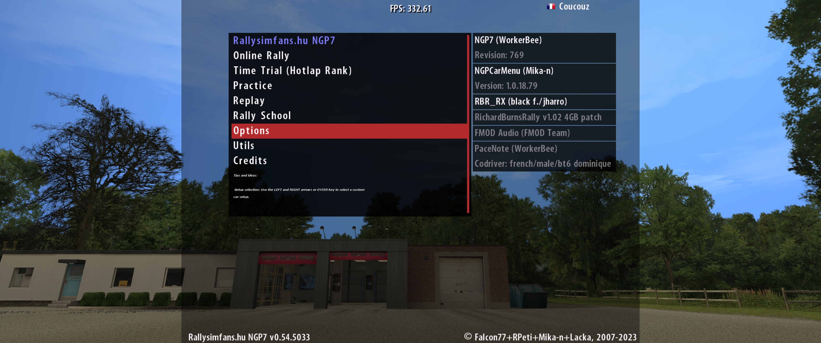 Une fois qu'on a fait çà, on peut lancer le jeu. Une précaution avant: Une deuxième précaution: Vous cliquez en vous déplacant avec les fleches du clavier sur Options Dans ces sous menus là, par contre si vous voulez utiliser un shifter en H vous ne réglez pas les down up shift dans les controles. Il faudra le faire dans la page de reglage du plugin RBR H-Shift (mais il faudra aller chercher la dernière version du plugin ailleurs, qui permet de régler l'enfoncement d'embrayage pour autoriser le shift et une protection mémoire pour interdire de mettre une vitesse que ne possède pas l'auto et de faire planter le jeu). Et donc quand vous avez tout réglé (pour le son je vous recommande de baisser tout selon vos gouts en laissant les notes à fond) vous revenez à la page d'accueil. Ensuite vous pouvez aller dans RSF (tout en haut sur la page d'accueil du jeu, ou en relancant le jeu si vous lui avez demandé de lancer directement sur RSF) Online Rally pour aller rouler sur des rallyes en ligne Et surtout, tout doit passer par RSF maintenant. L'école de rallye, les championnats d'origine du jeu ne fonctionnent plus avec la physique modifiée. Après vous comprendrez tout à fait vous même. Le Discord francophone est joignable ici: Dedans vous trouverez plein de choses bien, comme des rallyes hebdomadaires et les liens vers d'autres championnats mais aussi et surtout pour débuter les notes personnalisées de Dominique (dans la rubrique COPILOTES). Quand vous êtes au volant vous pouvez ouvrir en double cliquant gauche un menu de reglages des notes. Avec çà vous êtes parés en théorie Message édité par Aubade le 20-08-2023 à 21:25:45 |