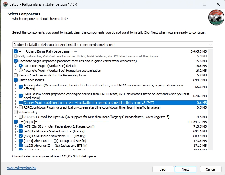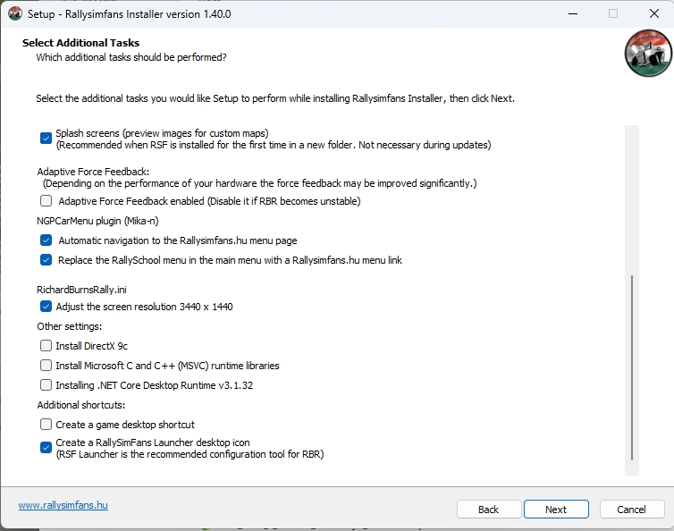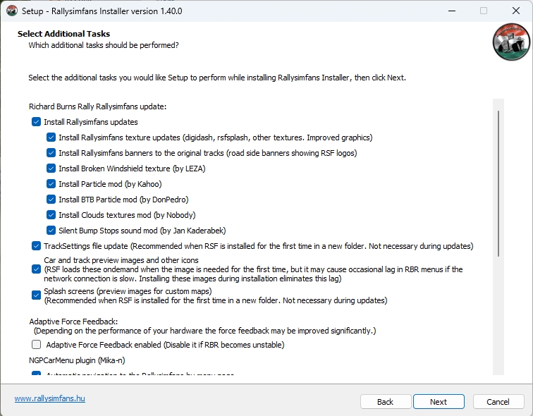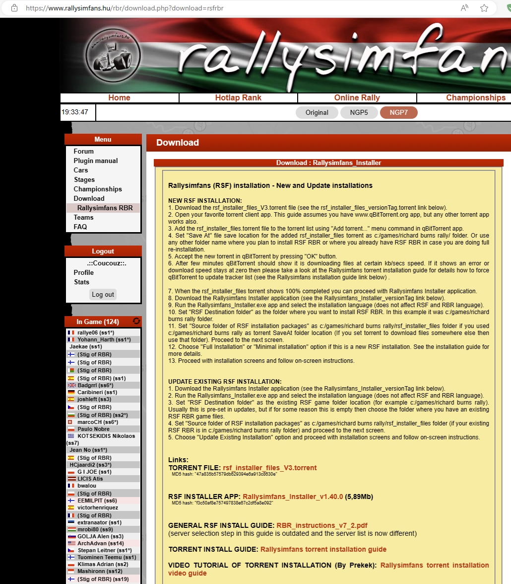 Aubade Transactions (0) | A la demande générale je vais faire un TUTO tout simple concernant l'installation de Richard Burns Rally en version modifiée par nos amis hongrois du site RallySimFans (https://www.rallysimfans.hu/) Pourquoi celui ci plutôt qu'un autre ? Et puis c'est Richard Burns Rally, le jeu est antique dans le monde des simulations mais le modèle physique avec la NGP (Next Generation Physics) est tout simplement dans le top tier des simulations modernes. RallySimFans c'est quoi alors ? Mais il y a de tout sinon, de la Trabant à la BMW M1 chez les anciennes, mais aussi toutes les gammes de groupe A et groupe N jusqu'à la Porsche GT+ et quelques R5 pour ceux qui aiment les choses modernes. Et donc pour articuler tout çà, il y a une interface dans le jeu qui permet de s'entrainer, de faire du hotlap ou de participer à des rallyes online (c'est du online désynchro, chacun roule dans son instance, et le plugin fait le lien avec les autres chronos déjà établis). Et sur le site, vous pouvez créer vos rallyes, consulter les rallyes en cours et leurs classements en cours ainsi que vous inscrire aux plus gros championnats. Mais il y en a d'autres qui fonctionnent aux rallyes bloqués par mdp, on y reviendra plus tard. Alors comment qu'on fait alors ???!!! Bah en fait c'est plutôt simple, même si ca l'était encore plus il y a peu de temps. Ce que vous aller télécharger par bittorrent sera la base des fichiers, elle sera toujours utilisée quand vous voudrez installer des spéciales qui vous manquent pour courir un rallye. Donc il faut choisir un répertoire "définitif" sur un stockage suffisant. Donc une fois que vous avez fini de télécharger, le truc le plus sympa à faire pour les autres c'est de laisser le torrent ouvert. Mais rien ne vous y oblige, vous devez juste être connectés à internet pour installer le jeu. Sur la même page, il faut aussi télécharger la RSF INSTALLER APP (la 1.40.0 à l'heure où j'écris) qui servira à installer le jeu en puisant dans ces fichiers téléchargés par bittorrent. Pour débuter: 2 choses importantes: dans la ligne d'adresse du bas, vous indiquez où se trouve le répertoire des fichiers d'installation téléchargés par bittorrent (moi c'est dans le même répertoire que mon jeu, mais vous faites comme vous voulez) A un moment, votre antivirus ou windows lui même couinera comme quoi y'a un keylogger dans le fichier. C'est vrai mais il n'est en mémoire que quand le jeu est lancé. Et il est nécessaire pour naviguer dans les menus. Et il faut aussi avoir les librairies Microsoft .netcore runtime installées. Dans le doute on peut le demander dans l'installation. Donc vous validez et arrivez à une étape que vous verrez à chaque fois que vous devrez faire une mise à jour du plugin. Souvent la mise à jour corrige certaines choses et surtout ajoute des spéciales. Vous choisissez FULL INSTALLATION pour cette fois, puis UPDATE pour les prochaines mises à jour. Vous ne changez rien, là c'est où l'installateur ira télécharger ce qu'il doit. Ce serveur marche généralement bien Là vous choisissez ce que vous voulez installer. Dans la partie haute je recommande au moins tout çà. Et le mod VR si çà vous branche. Dessous vous avez les spéciales que vous voulez installer dans le jeu MAINTENANT. Si vous avez de la place sur le disque du jeu, faites vous plaisir et lachez vous. Ca sera ca de moins à ajouter à la main plus tard.