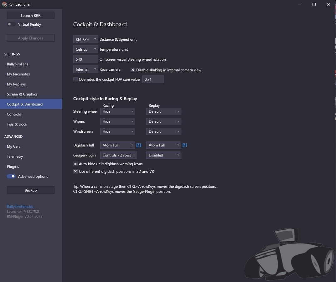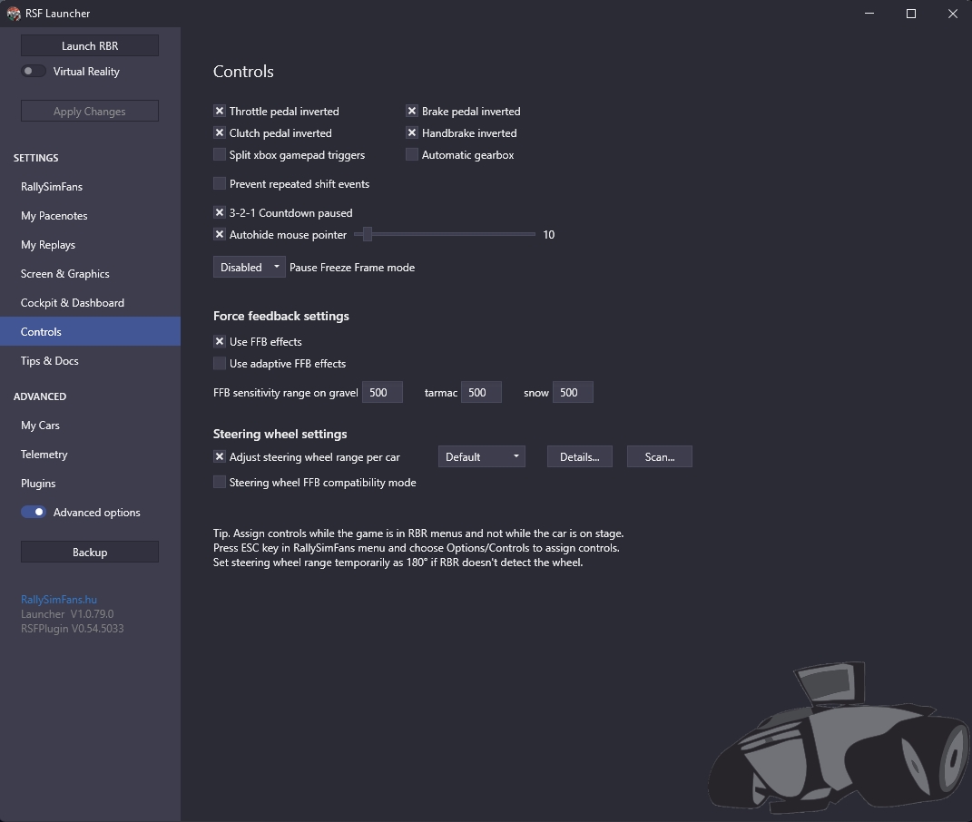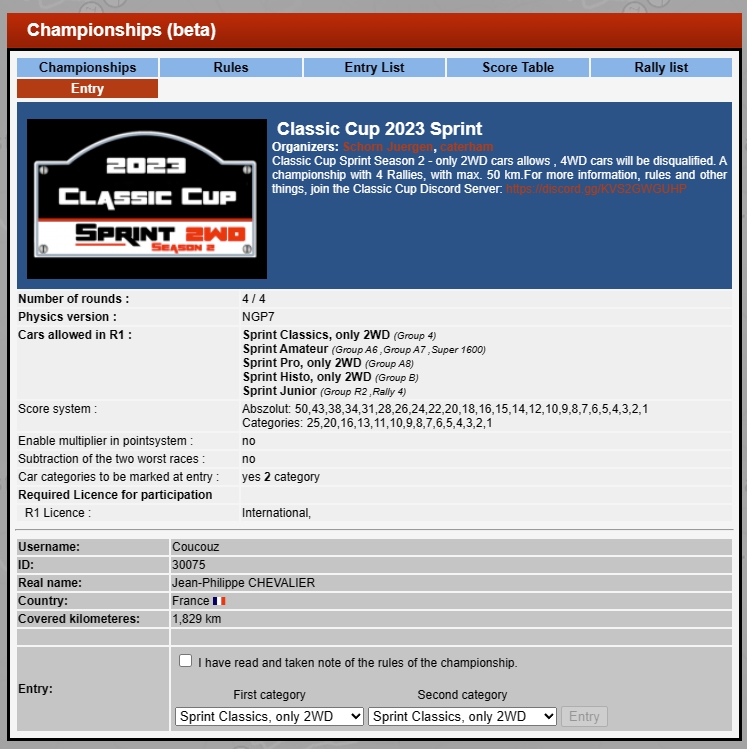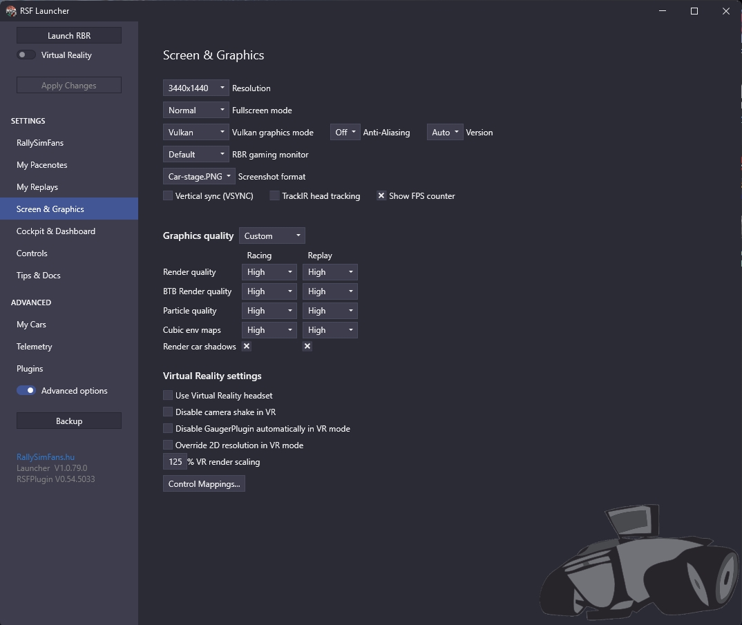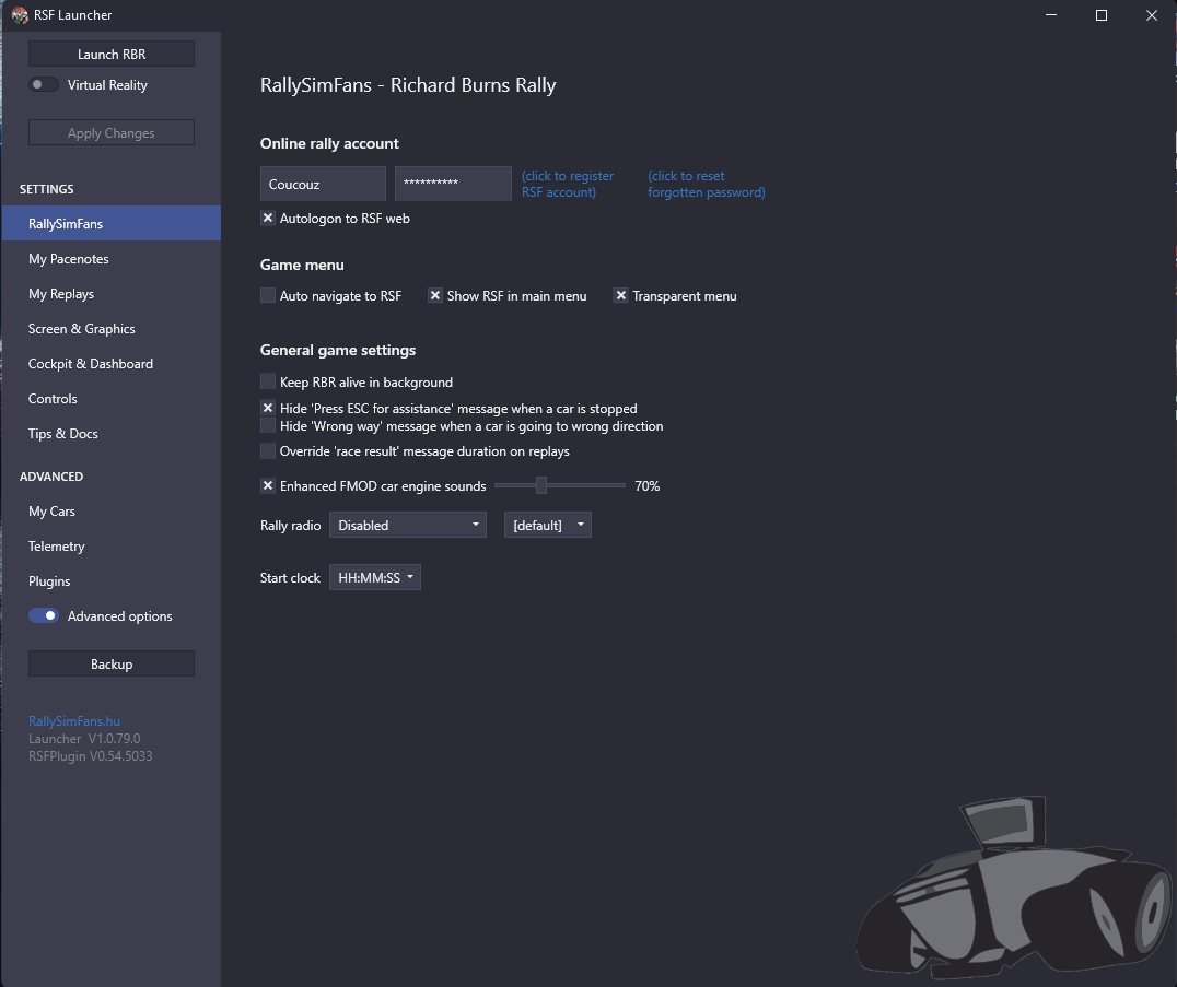 vous acceptez et ca vous amène à ce dernier récapitulatif avant installation du jeu J'insiste sur l'importance du plugin pacenotes, sinon vous ne pourrez pas utiliser correctement les carnets de note perso plus tard. Et il FAUT avoir des notes corrigées pour chacune des spéciales, certaines sont ultra mal notées... et c'est un vrai motif de dégout du jeu tellement il est punitif. vous acceptez et allez prendre un café pendant que ca mouline. En fonction de votre CPU et de votre connexion ca peut etre TRES long (vous allez decompresser 100Go de données, et en télécharger une partie en plus ...) Et sur votre bureau, vous retrouvez l'icone de l'interface de lancement du jeu avec le plugin (RallySimFans Launcher) Hyper important, vous passerez là souvent. Si ce n'est pas encore fait, il va falloir créer un compte sur le site RallySimFans Profitez en pour aller voir quelques championnats gérés directement sur le site RSF vous cliquez sur leur image et ensuite ENTRY dans le petit menu qui apparait pour donner quelques informations aux organisateurs comme la catégorie dans laquelle vous voulez participer Souvent il y a un serveur Discord associé, la communication concernant l'organisation passe par là. C'est important. Et il y aussi un Discord francophone qui gère quelques championnats relevés et avec pas mal de participation. On y reviendra plus tard. Maintenant que vous avez un compte RSF, vous allez pouvoir lancer le launcher et arriver sur la page d'accueil Là vous filez directement en bas de la colonne de gauche pour cliquer "Advanced Options". Là vous réglez vos choses. Mon écran est ultrawide d'où la réso bizarre. Mettez la votre, là où j'ai Vulkan je peux aussi avoir D3D ou Vulkan + Simhub (pour améliorer la compatibilité avec les overlays de Simhub). Vulkan est obligatoire pour le mod VR. Ensuite la page Cockpit and Dashboard pour régler l'affichage en surimpression et le point de vue. Nous on roulera KM et KPH et Celsius. Le volant je ne l'affiche pas alors je règle n'importe quoi dans l'angle de rotation. Sinon choisissez la même chose que votre volant physique pour que ca rende mieux. Ensuite les autres réglages c'est comme vous voulez. Le parebrise n'est pas vraiment caché dans mes réglages, c'est juste la texture interne associée qui n'est pas affichée (si vous avez des skins avec bandeau de parebrise où ce genre de truc). Mais si tape une branche ou roule sur le toit, j'aurai un beau parebrise Carglass compliant. Ensuite on passe aux controles Là ca dépend de votre matériel. Moi je dois régler comme çà avec mon Heusinkveld et mon frein à main maison. Et j'utilise les réglages de rotation du volant réels des autos dans le jeu, il faut pour celà avoir un réglage dans le gestionnaire du volant qui égale au moins la rotation réelle de l'auto simulée. Je suis à 1400 degrés dans Simucube pour être large (je crois qu'il y a une Fiat groupe 4 qui a une rotation à 1260 dans le jeu)