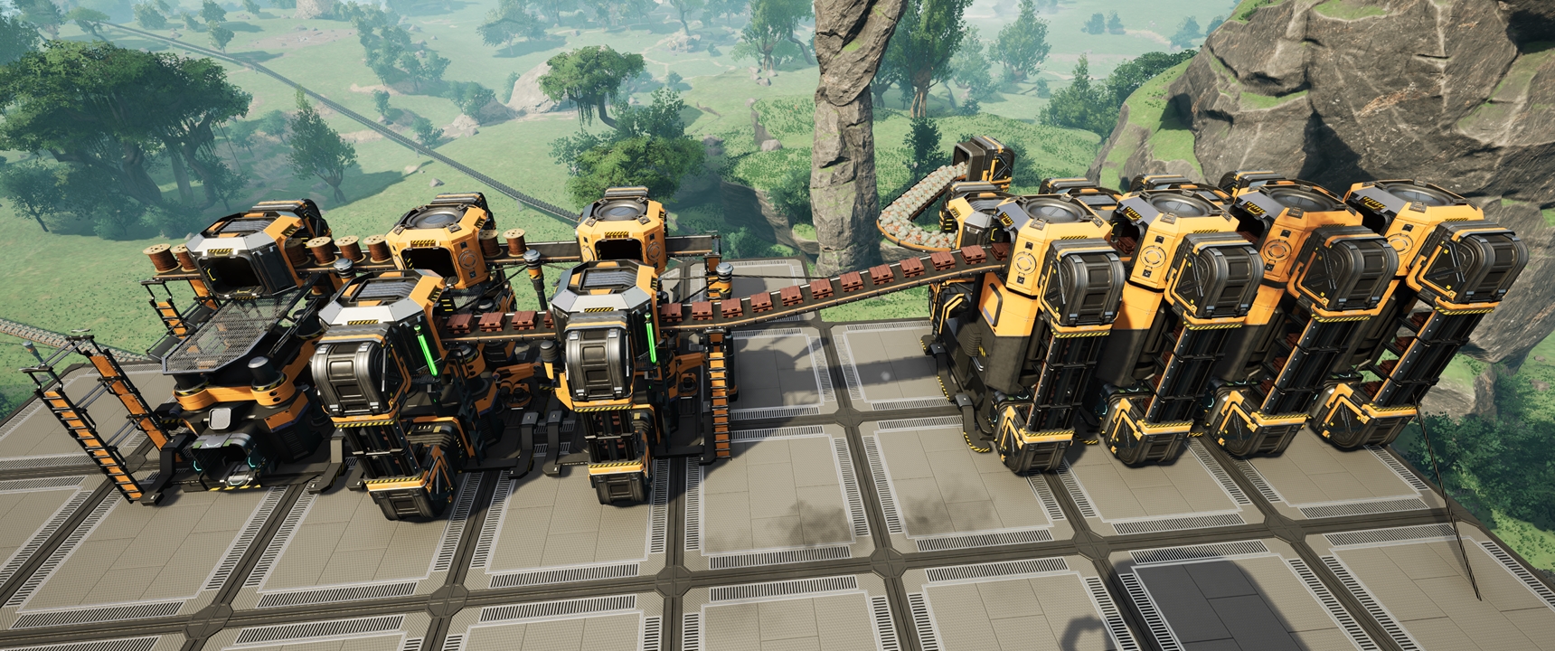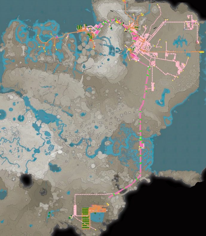 Base principale oui, j'ai voulu maettre l'ascenseur le plus bas possible et tout construire autour. J'ai une base secondaire pour le pétrole en faisant passer le t rain de le canyon, et quelques usines exportées quand les noeuds étaient regroupés. Enfin le turbofuel au blue crater.