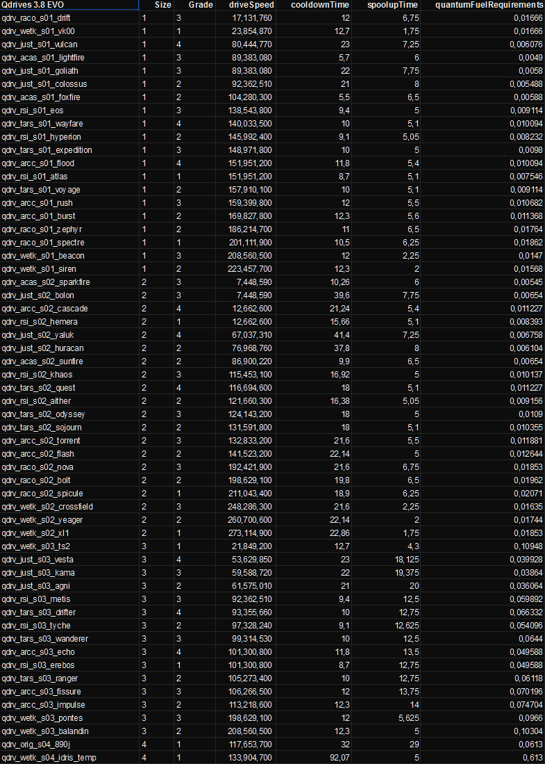 ykhdrazhir What The Deuce?!Transactions (0) | Ces chiffres sortent du tout premier build 3.8.0 EVO dont les fichiers avaient fuité. C'est moi qui les ai sortis pour les gourmands de SC Leaks. Ils ont très bien pû changer entre temps. Aussi les stats sont partielles, par exemple les stats de Power et Heat ont également beaucoup changé. |
