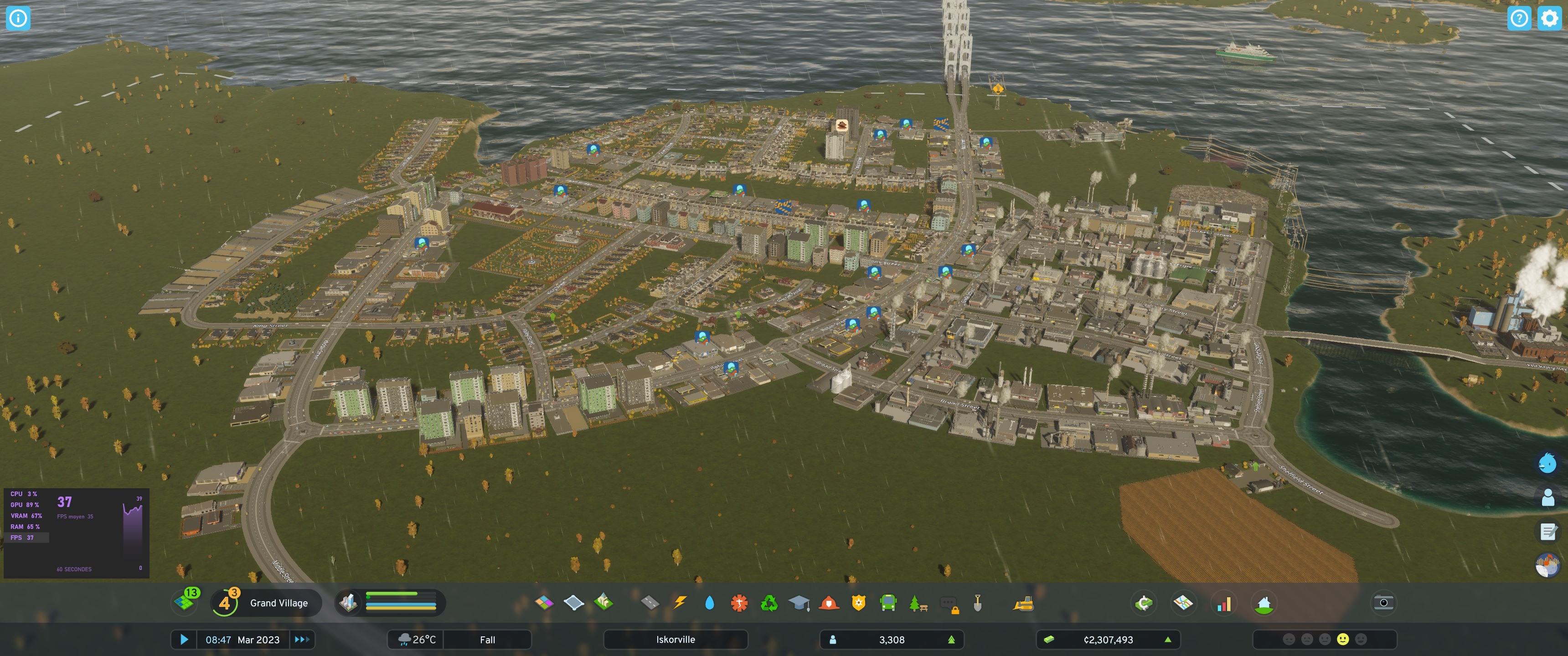 iskor Transactions (0) | Voilà ma fameuse ville de 3200 habitants qui me vaut 37-40 FPS... Les bâtiments de service sont aussi BEAUCOUP plus gros qu'avant, sur mon screen, tout à droite c'est la centrale à charbon de base et l'espèce de gros rectangle sur le milieu-gauche est un... Cimetière Message édité par iskor le 24-10-2023 à 22:13:12 |