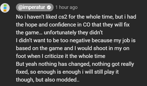 BoraBora DilettanteTransactions (0) | Elle est là depuis le début comme CEO et avait très bien managé la boîte pendant des années, avant le naufrage CS II. Elle a fait d'un minuscule studio finlandais sans fonds ni réputation un acteur important du jeu vidéo mondial. Les responsabilités de la situation actuelle sont largement partagées puisque la boîte est détenue par ses employés, et j'imagine seulement les "historiques" comme elle et le chef dev que l'on voit dans plein de vidéos, bref ceux de l'époque CiM, qui sont invirables. Je vois plus trop quoi attendre du studio dans son ensemble. Ils sont sous-dimensionnés en personnel et les devs ont atteint leur limites depuis longtemps tout en se croyant plus doués qu'ils ne sont. Message cité 1 fois Message édité par BoraBora le 10-02-2024 à 00:59:53 --------------- Qui peut le moins peut le moins. |