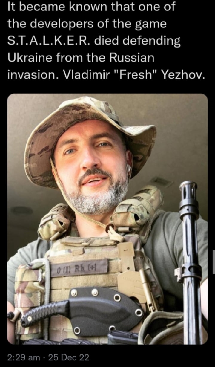 Jacquot martin Transactions (0) | Volodymyr Yezhov, un des développeurs de STALKER, Killed in action le 26 décembre. --------------- Membre de la T.E.P.A. Dans le but de contribuer à une amélioration dans la mesure où il y aurait lieu de le faire. |