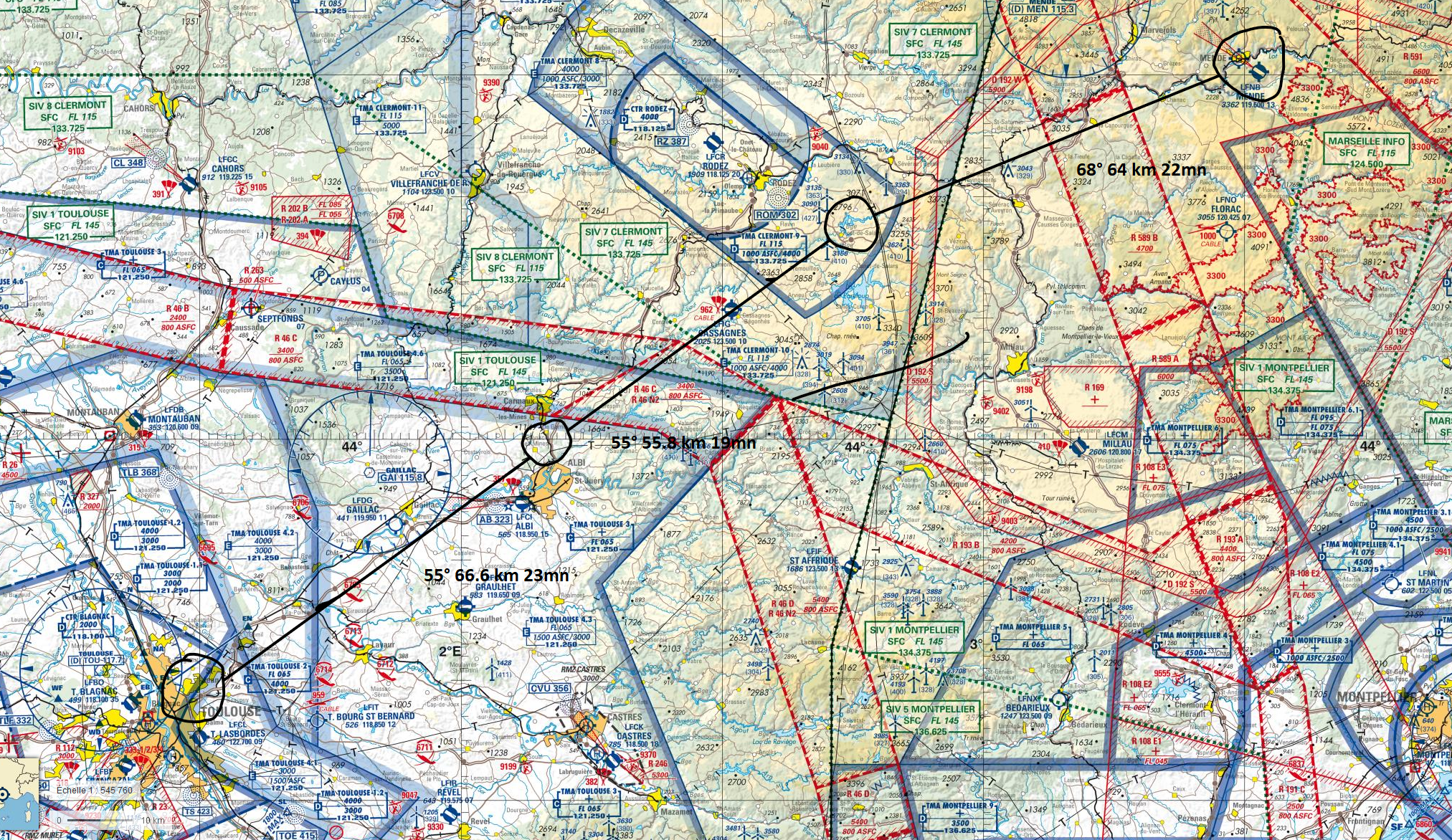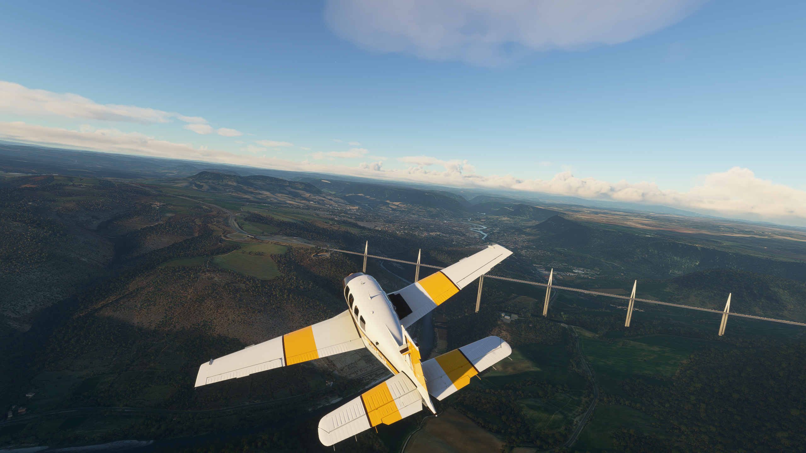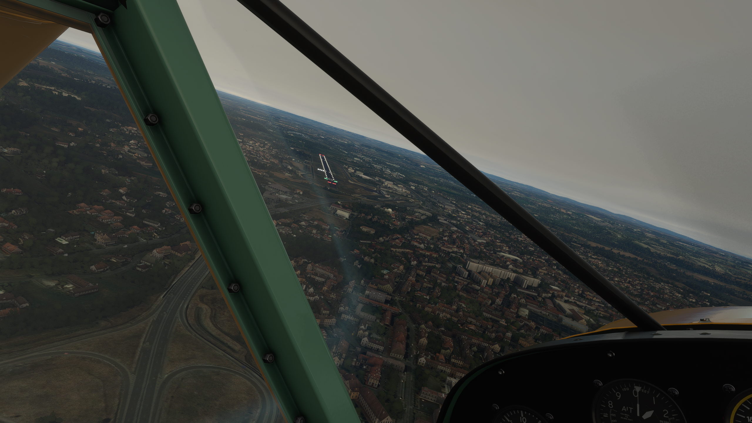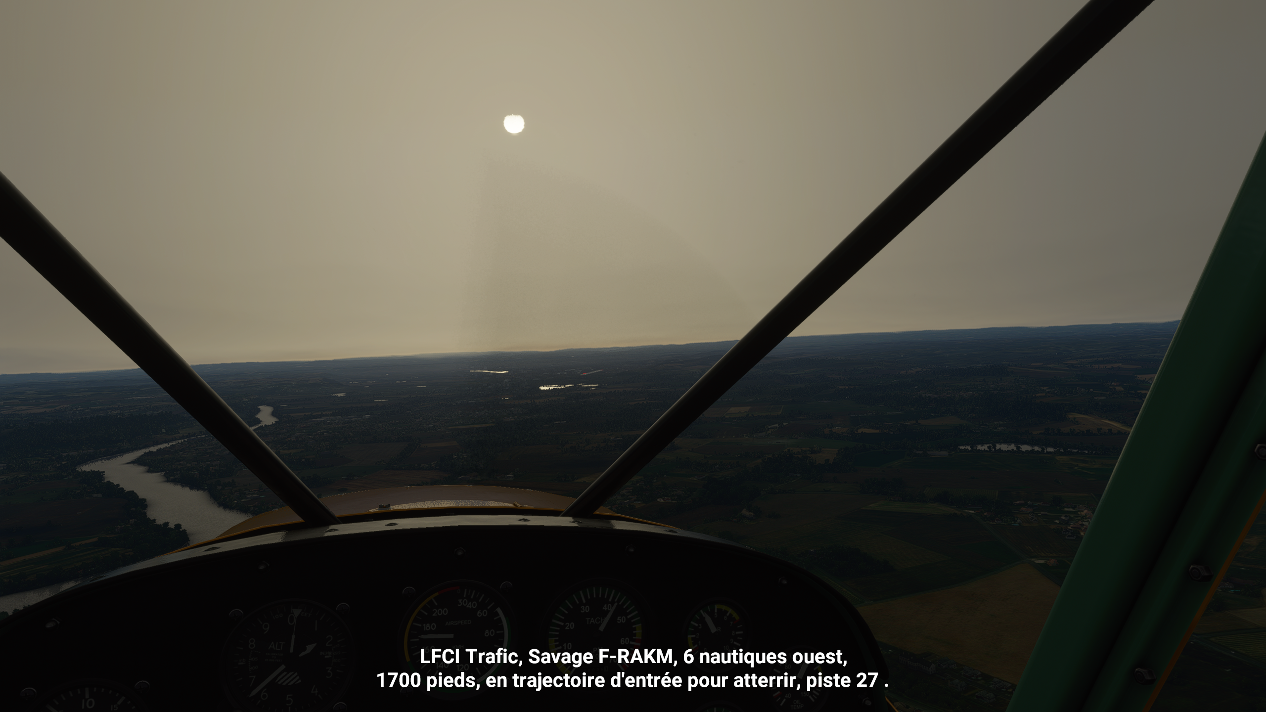 Qu'est-ce que... pardon ? En parlant du viaduc... Le Tarn continue vers le Nord, on vire au dessus de Millau Les gorges sont plus raides et hautes, on va rester un peu plus haut pour éviter un tour en hélico de force, et pour ne pas perdre le VOR de Mende qui m'indiquera quand arrêter de suivre le Tarn Une fois la radiale 307/53 interceptée, c'est le signal pour virer plein Nord. Pas le bon angle sur le screen, mais les balises de la piste étaient vite en vue Bonsoir LFNB