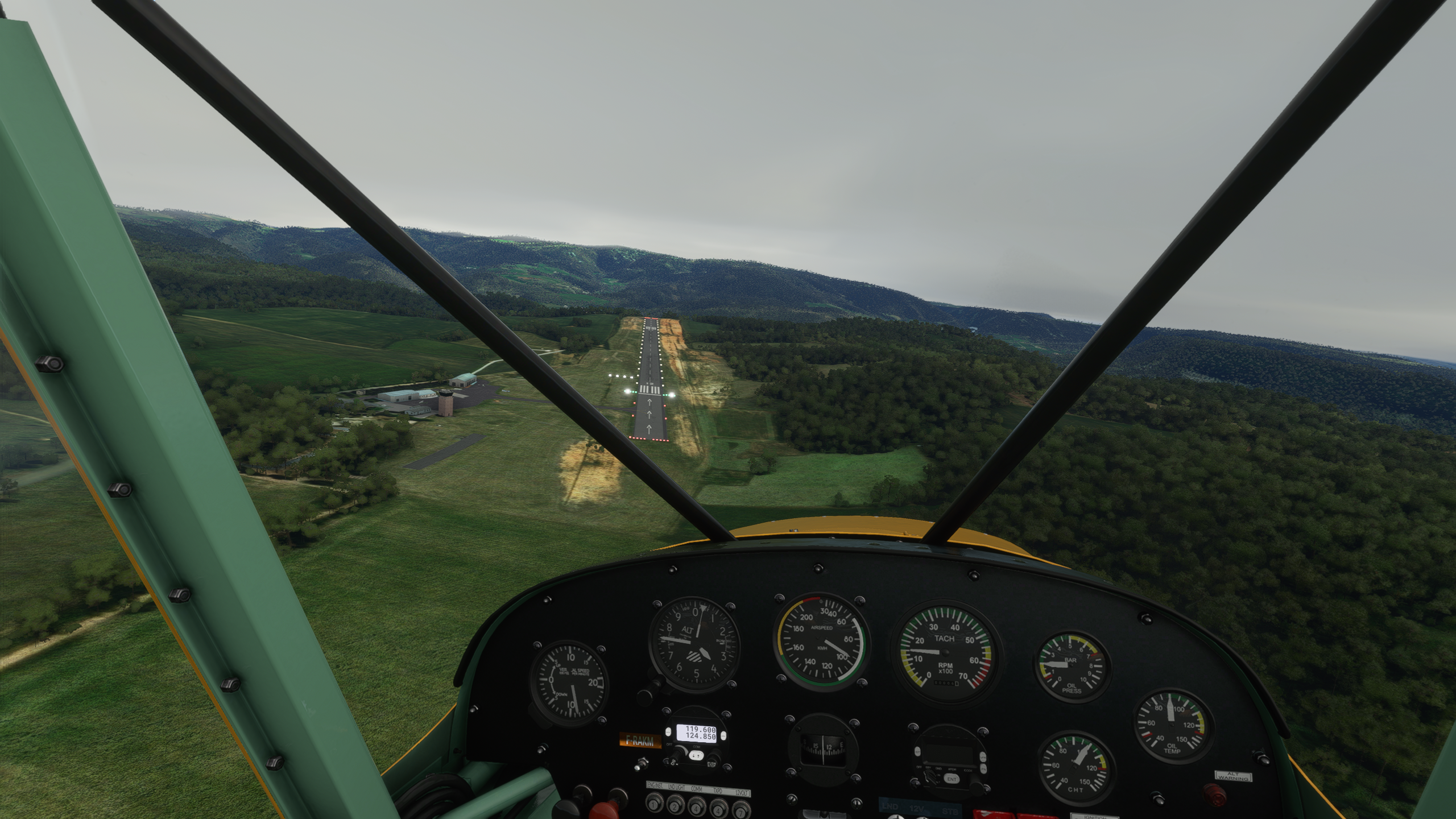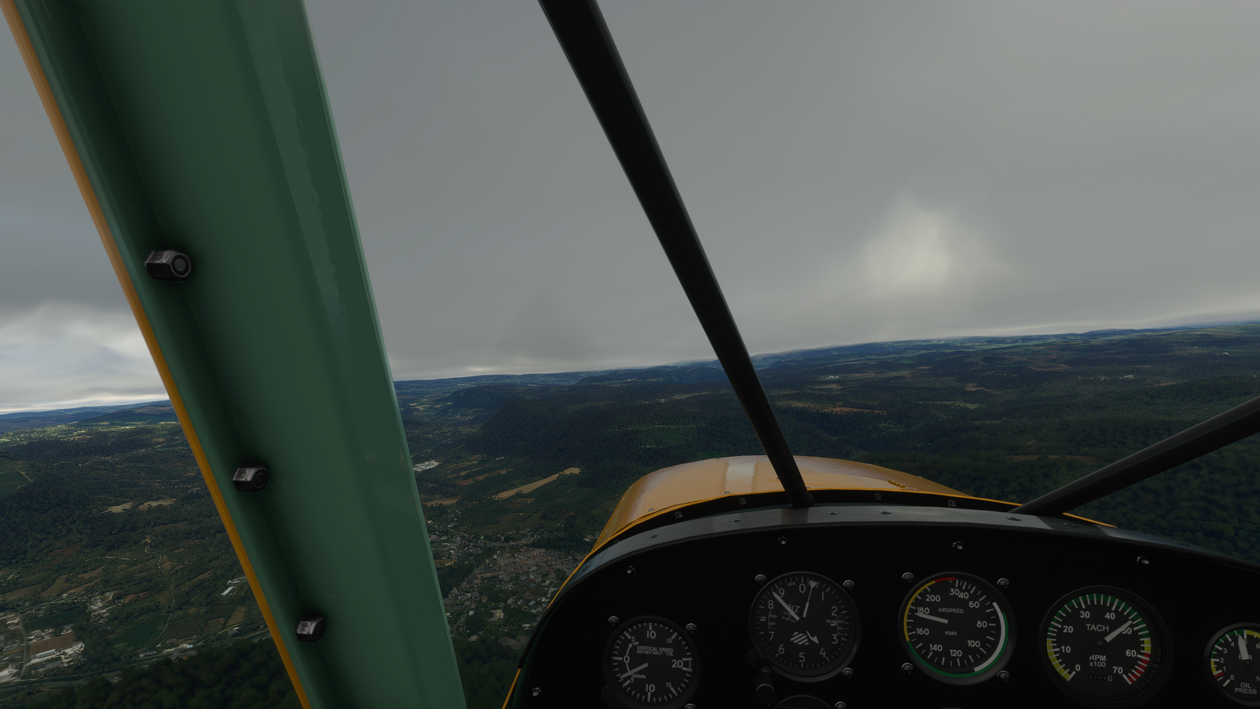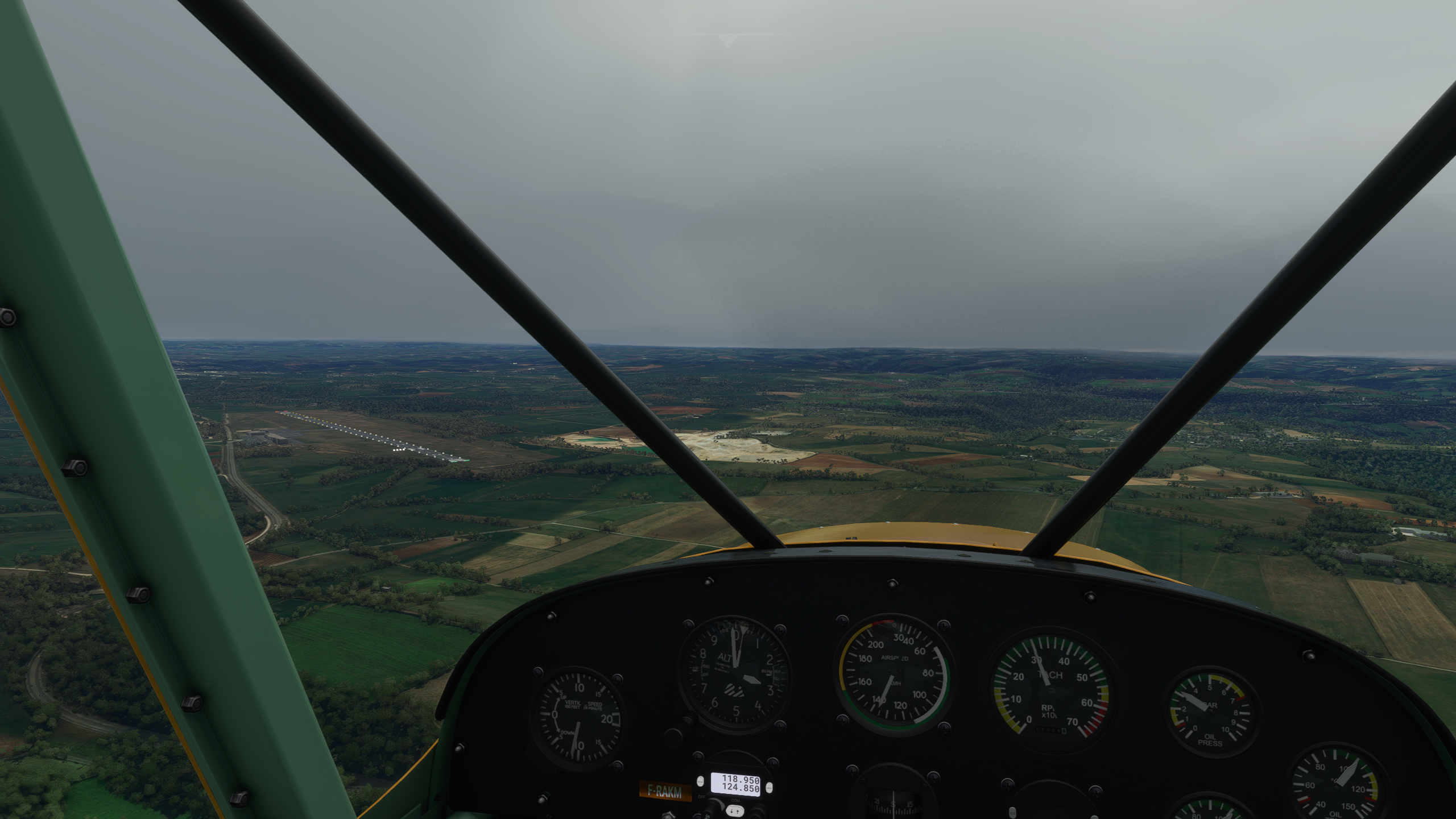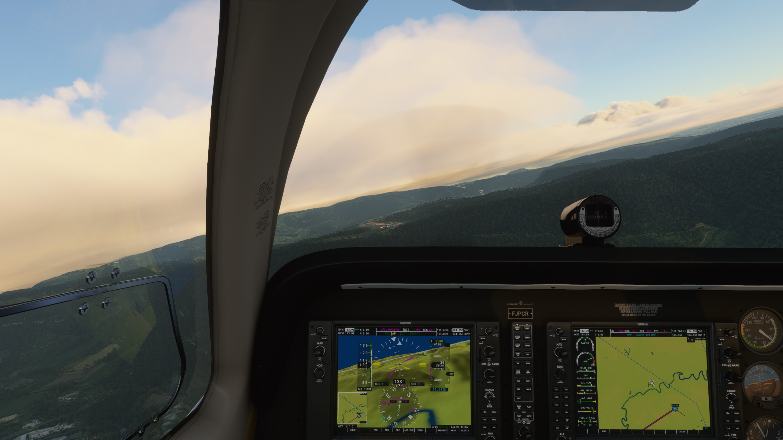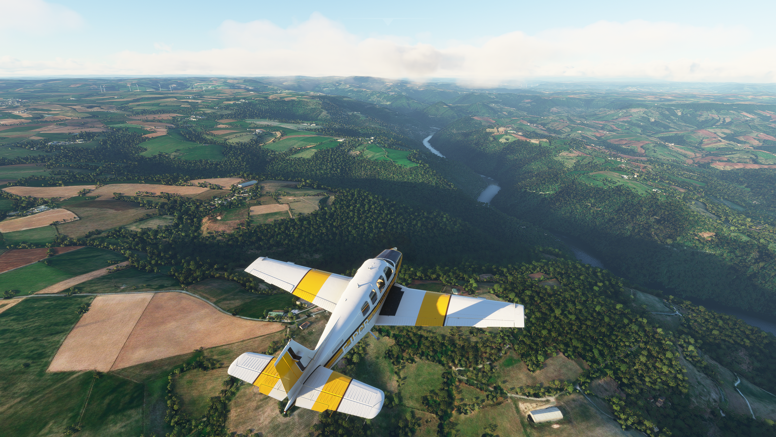 Qu'est-ce que... pardon ? En parlant du viaduc... Le Tarn continue vers le Nord, on vire au dessus de Millau Les gorges sont plus raides et hautes, on va rester un peu plus haut pour éviter un tour en hélico de force, et pour ne pas perdre le VOR de Mende qui m'indiquera quand arrêter de suivre le Tarn Une fois la radiale 307/53 interceptée, c'est le signal pour virer plein Nord. Pas le bon angle sur le screen, mais les balises de la piste étaient vite en vue Bonsoir LFNB