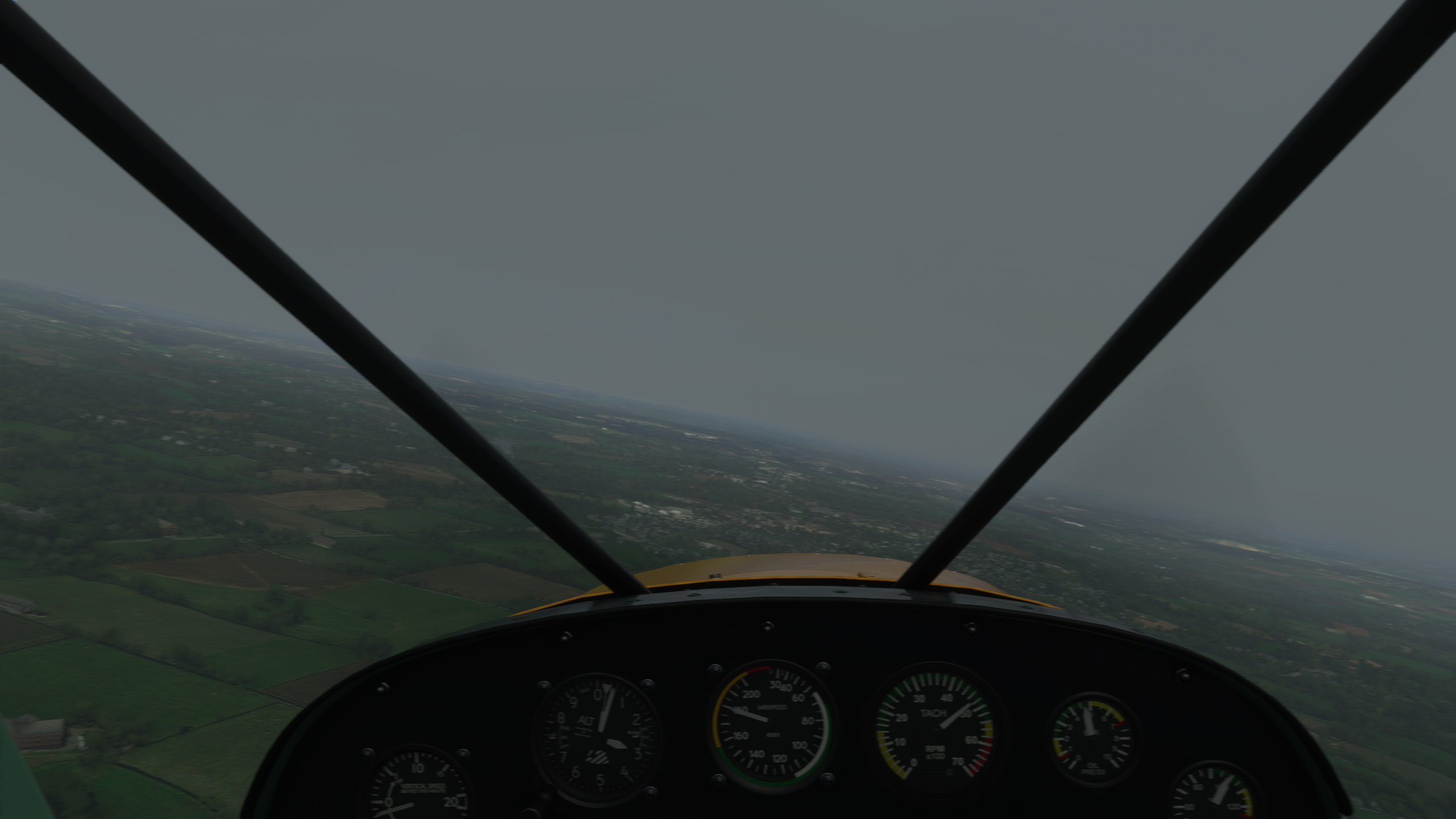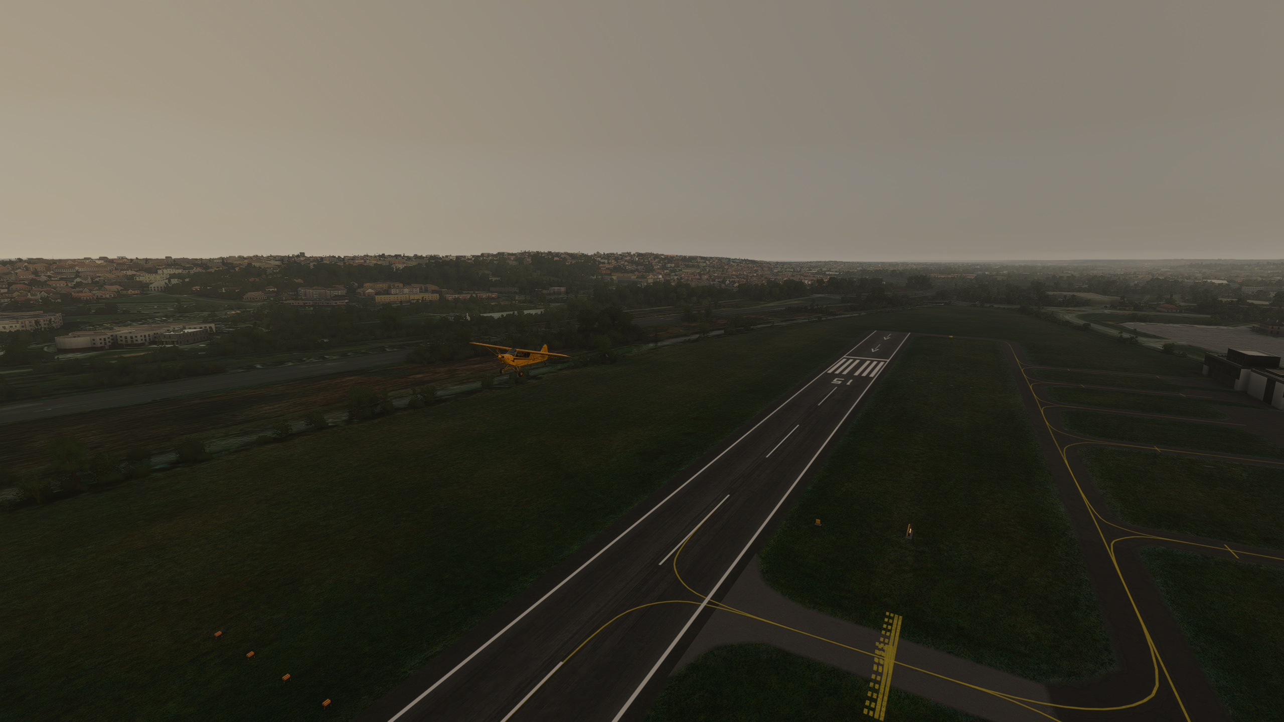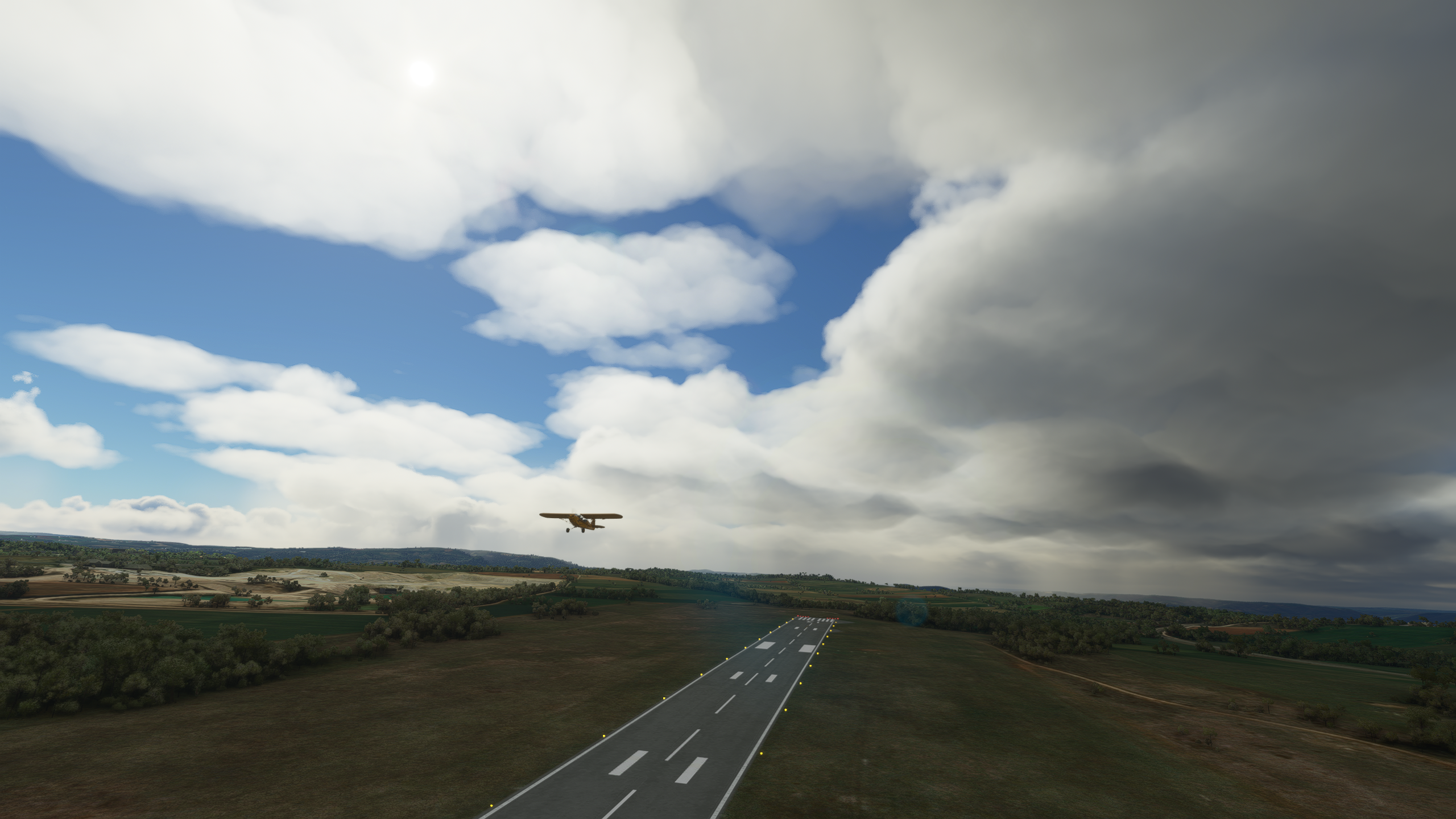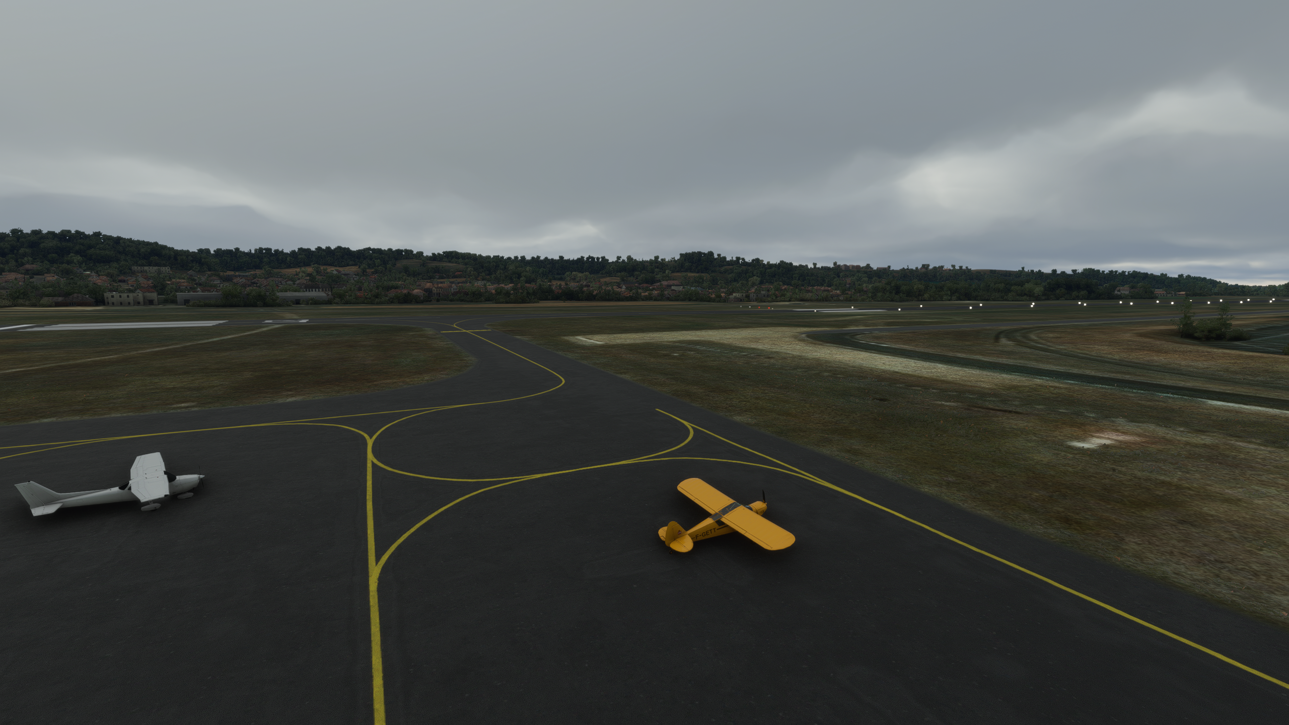 Qu'est-ce que... pardon ? En parlant du viaduc... Le Tarn continue vers le Nord, on vire au dessus de Millau Les gorges sont plus raides et hautes, on va rester un peu plus haut pour éviter un tour en hélico de force, et pour ne pas perdre le VOR de Mende qui m'indiquera quand arrêter de suivre le Tarn Une fois la radiale 307/53 interceptée, c'est le signal pour virer plein Nord. Pas le bon angle sur le screen, mais les balises de la piste étaient vite en vue Bonsoir LFNB