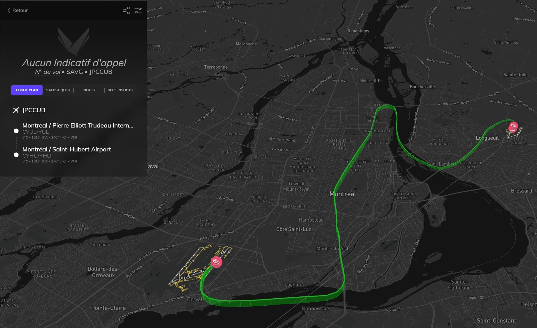 Aubade Transactions (0) | #Rallye #QC #Leg 9bis Circuit Ville-Marie Le nom de l'étape parle de lui même mais, dans l'anticonformisme, je le fais à l'envers depuis CYUL (Trudeau) vers CYHU (Saint-Hubert) Décollage tôt le matin, vue la vitesse de décollage de la libellule je m'élance depuis le milieu de la piste et ca monte tout seul On rejoint le pont Honoré Mercier qui est normalement le point de sortie du circuit vers le Sud, ca sera notre point d'entrée, vers l'Oratoire L'Oratoire, l'université et la ville moderne le long du fleuve On continue vers le nord pour survoler le complexe olympique avant de bifurquer au dessus du fleuve au niveau du pont tunnel On survole l'ile Notre Dame au niveau de l'épingle du bout du circuit de F1 puis je file vers ma destination, en oubliant de prendre en photo l'endroit ...