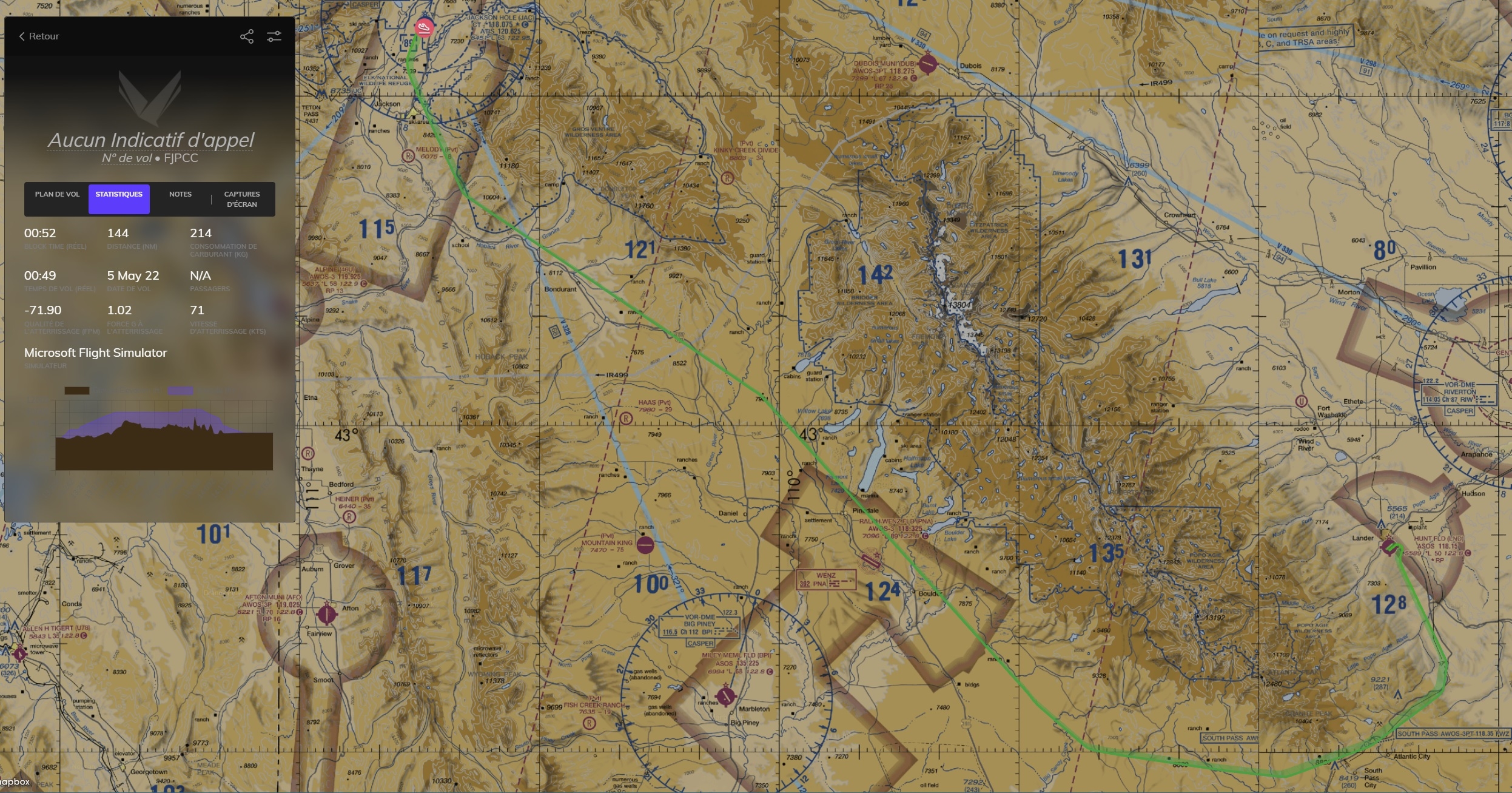 Aubade Transactions (0) | #CR #us.rockies Etape partielle ce jour, parce qu'il fait mauvais là bas et que j'ai envie de profiter du paysage entre KLND et KJAC. J'ai oublié de lancer Volanta avant le décollage mais la trace commence relativement près du terrain de départ C'est parti, au départ c'est beau temps mais ca va se gater un peu en route On ne doit pas voir partout le sol par là, mais on y va quand même Passage bas sur WY17 en longeant la ligne haute tension sur l'approche Agence Tous Risques (J'étais plus bas un peu avant mais pas dans une position suffisament confortable pour tourner la caméra Visibilité parfaite en approche de KLND Au moins on a des beaux phénomènes optiques Et me voilà arrêté à coté de la tireuse à bière pour attendre le beau temps Message édité par Aubade le 04-05-2022 à 17:58:58 |