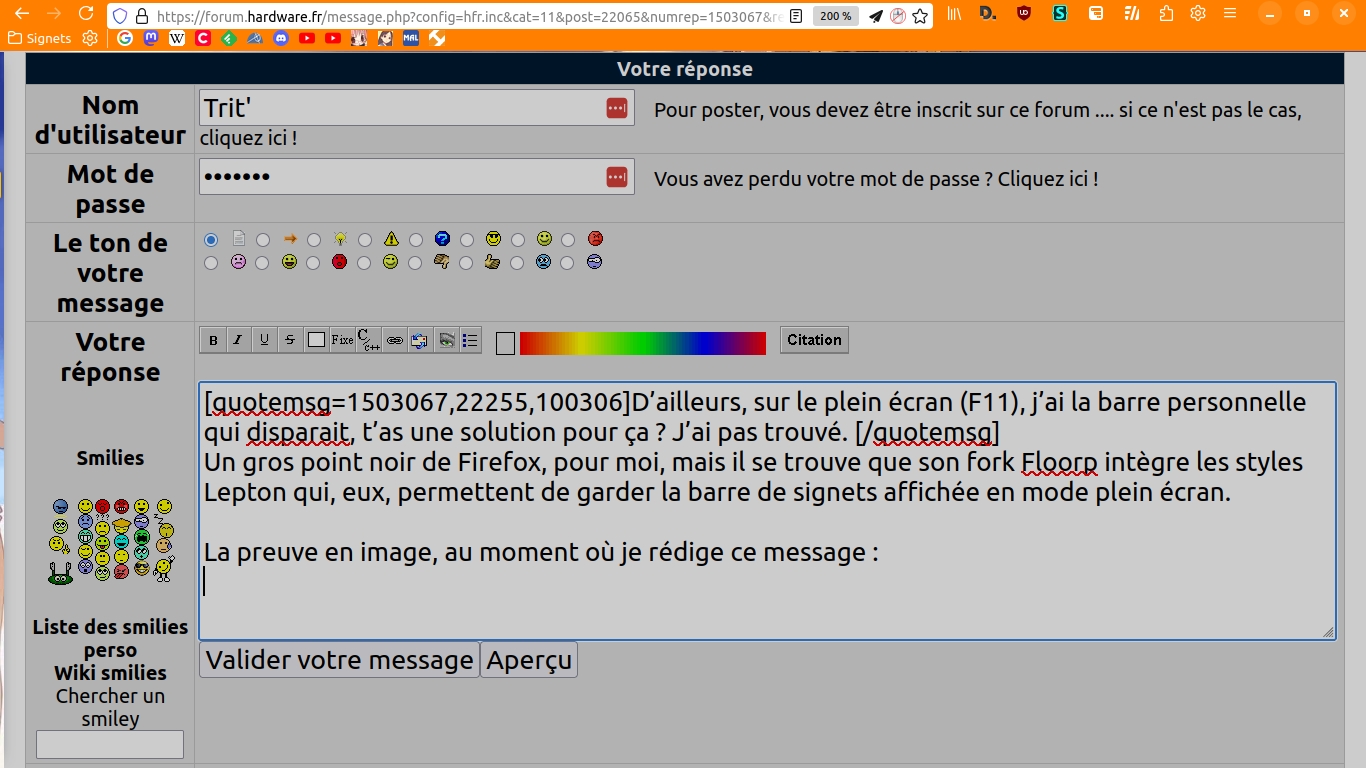 D’ailleurs, sur le plein écran (F11), j’ai la barre personnelle qui disparait, t’as une solution pour ça ? J’ai pas trouvé. Message cité 3 fois Message édité par Winpoks le 27-08-2025 à 09:24:14 |