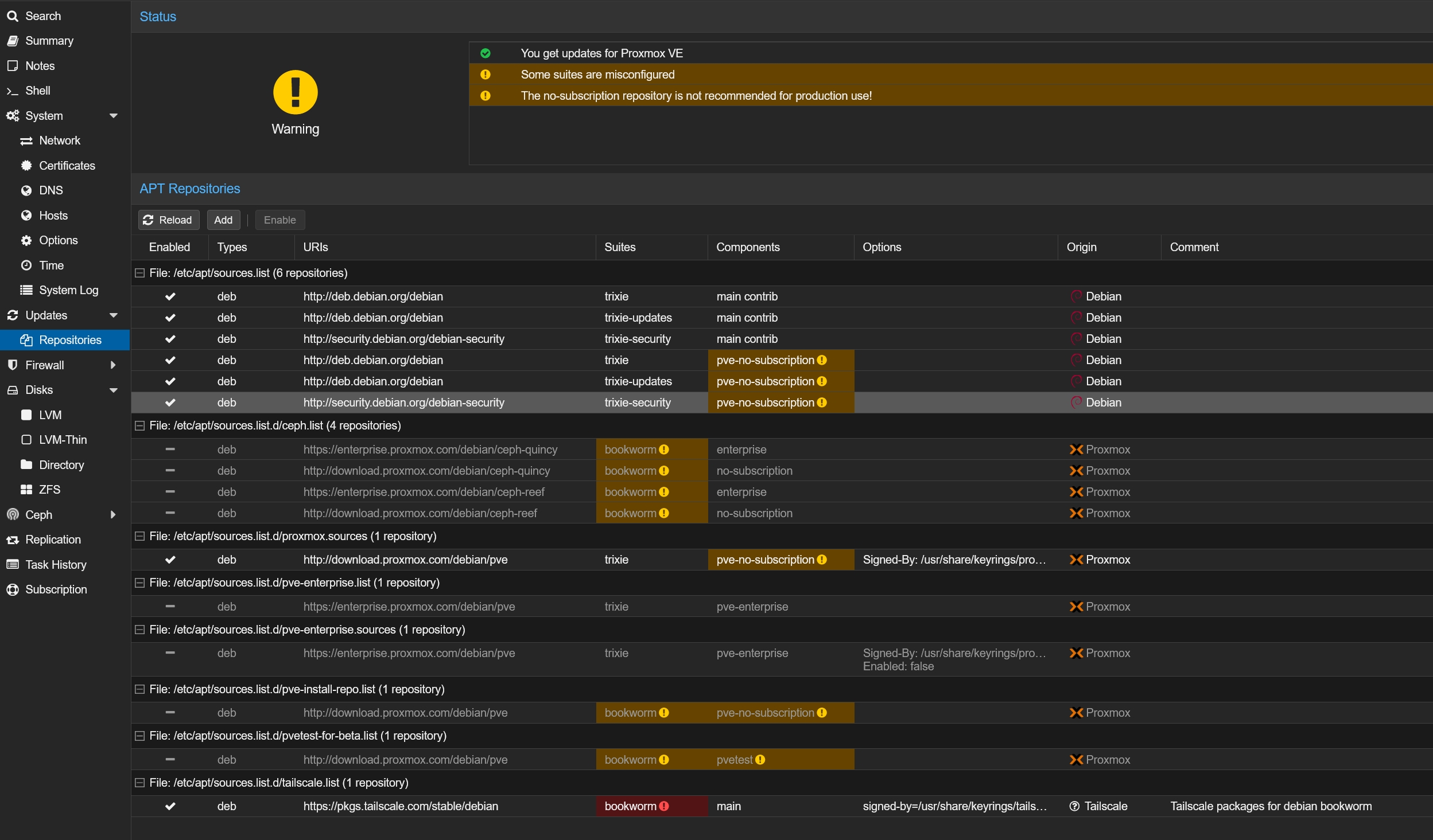 Vire tout ce qui concerne bookworm, commente tout ce qui concerne pve-enterprise et voilà Message édité par Iryngael le 15-10-2025 à 12:17:32 --------------- /!\ Le point de rendez-vous des amateurs de vieux matos informatique c'est ici !/!\ |