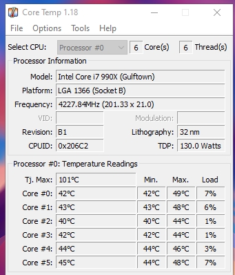 Je pense que HWMonitor n'est pas calibré, d'ailleurs je vais plutôt utilisé CoreTemp pour avoir la température et la charge CPU, il est calibré : Le problème avec l'augmentation du BCLK c'est la chauffe que cela engendre : à fréquence égal, un CPU OC avec un BCLK + élevé chauffera +.