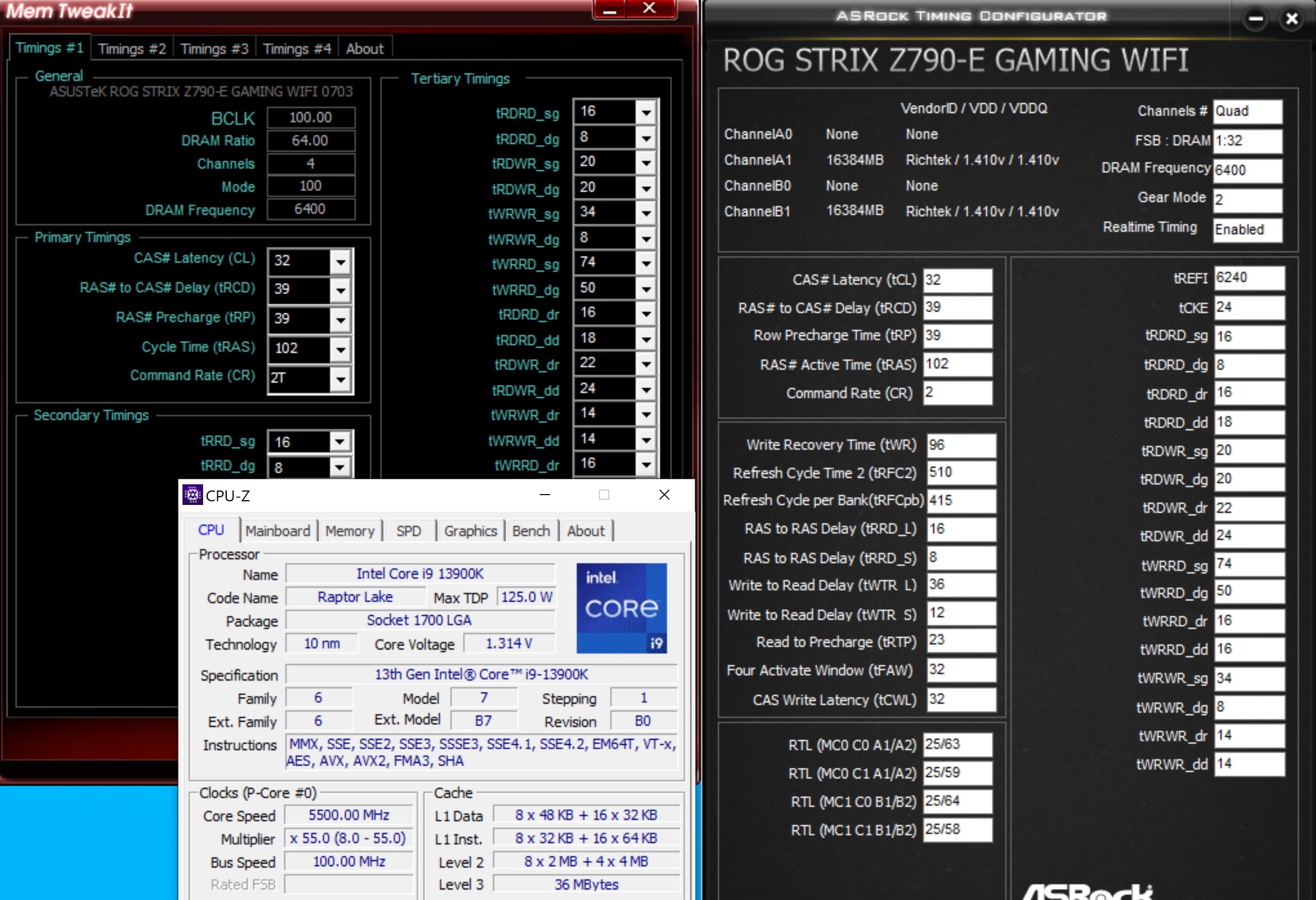 aster Chaotic Neutral | Je mets un peu les formes, ça servira au 1er post quand je prendrai le temps... Pour certains timings, j'ai indiqué le réglage opti (sans forcer), puis le réglage safe. (OPTI>SAFE) et en rouge quand c'est au taquet. Si j'ai rien mis en rouge, ça se tente de pousser encore Toutes les Hynix M.die font ça avec 1.4-1.45V à 6400. Sur mes screens précédents, on voit que j'ai dû mettre certaines valeurs "safe" pour passer 6666 et 6800. Primaires : Secondaires : Ceux-là vont ensemble, tFAW doit être égal à 4 fois le mini des 2 autres tRTP : 8>12 Tertiaires : Write to Write Read to Write Write to Read Tu as un 13900K donc 16 E-cores. Chaque E-core actif ajoute ~0.4ns de latence. Message cité 3 fois Message édité par aster le 30-11-2022 à 22:14:06 |
