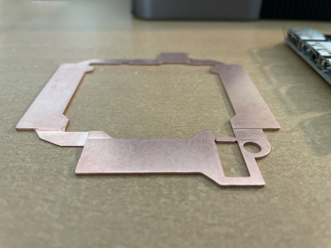 clusmi | Pour répondre à vos questions, la plaque de cuivre fait au maximum 1mm d’épaisseur, et au minimum (pour passer au dessus des soudures et autres composants du PCB) 0.4mm. Une partie est a 0.8 mm.
