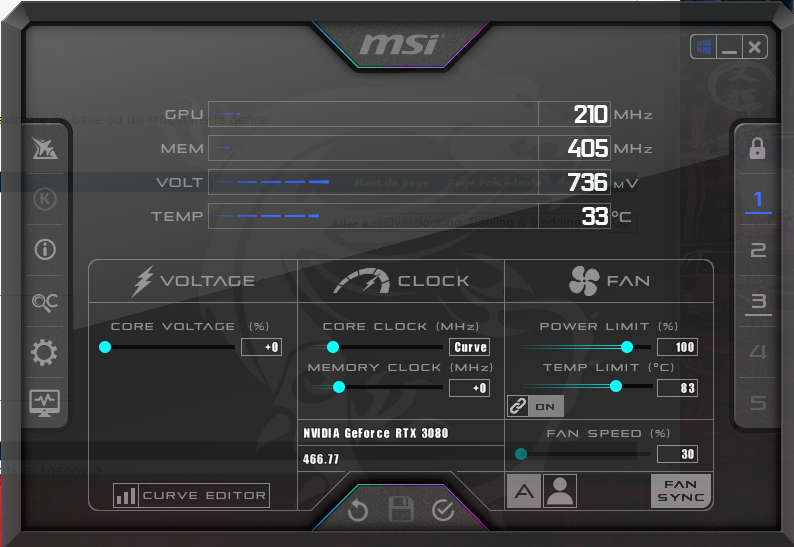 ganon304 | J’ai un soucis avec Afterburner, j’ai réussi a UV mais a chaque redémarrage j’ai la tension qui se remet en automatique, j’ai suivis les différents tuto ici et meme si le net et ca ne règle pas ce soucis. Ca m’embête un peu car la carte dépasse souvent les 1V (3090FE)