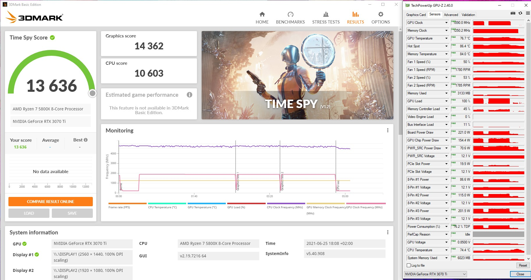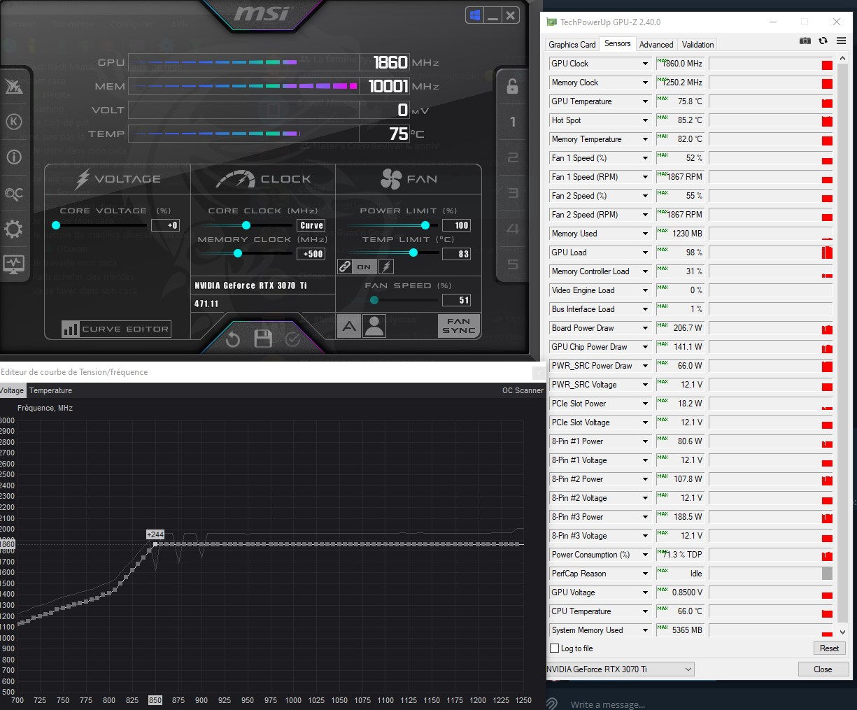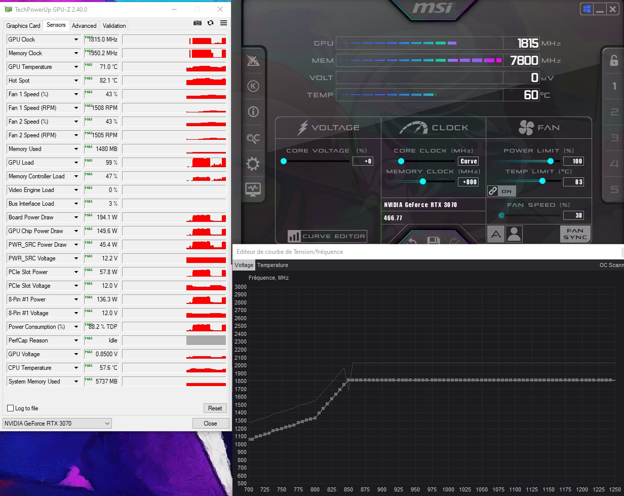 $crounz Désolé, c'est de la merde. | Résultat pas trop poussé avec ma 3070TI FE. Clock 1860MHz @ 0.850v ça amène la carte à 206W maxi me dit GPU-Z, les températures sont sympa. Par contre, Afterburner fait toujours un peu ce qu'il veut quand je programme la courbe mais en persévérant un peu, ça va !! edit : Message édité par $crounz le 25-06-2021 à 18:17:15 --------------- >>Feedback<< Topic ACH/VTE |