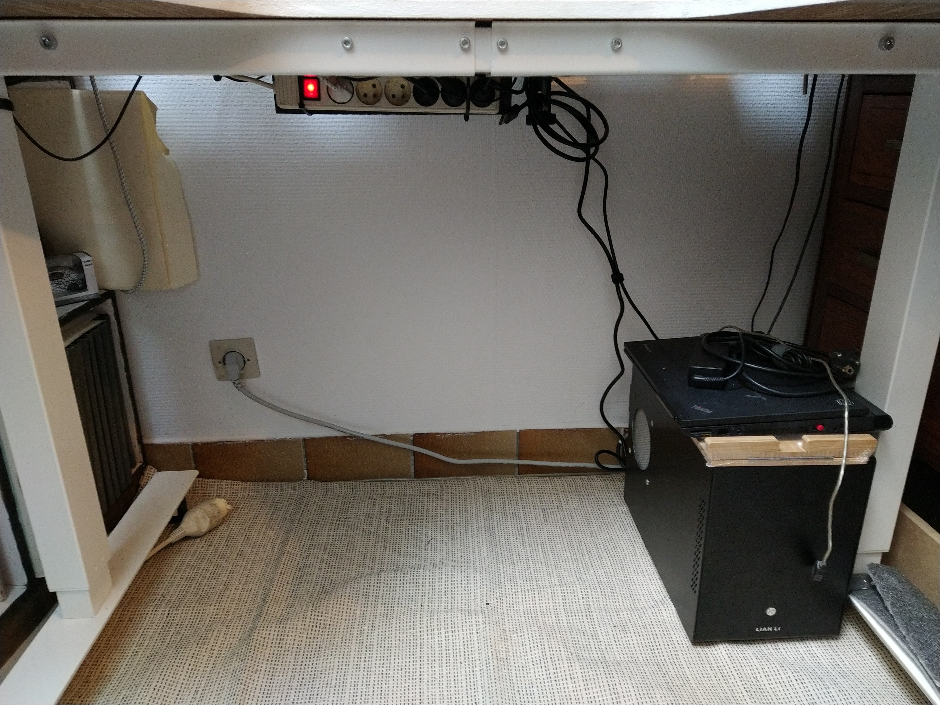arank'thnar aka Le Duc, Manouche de l'IT | Opération "Cable management" ce matin sur mon setup de TT. Il est sur une paire de jambes ikea assis-debout à manivelle (la flemme de vous chercher la ref.), sur 4 roulettes. Donc le tout bouge en hauteur et d'avant en arrière (besoin d'accéder aux tiroirs à droite). Bref avant, la multiprise était mal implantée. J'ai repris tout ca + fait mon câble management. Satisfait du résultat. --------------- Topic Bougnat - Mon Topic de A/V - Nos créations 3D - Geek'n Craft 63 |