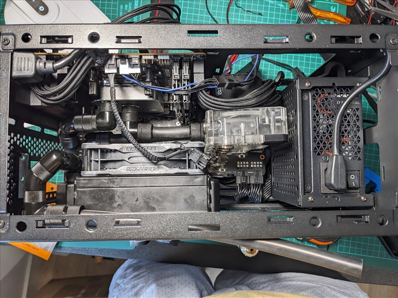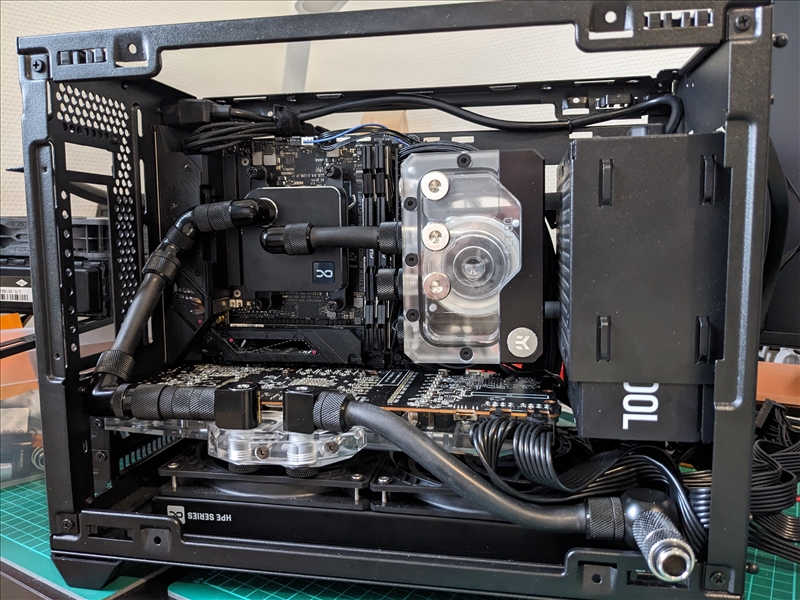 Alci | Après des années sans WC custom, je me suis lancé dans un projet un peu débile, mettre le maximum de choses dans un boitier mini-ITX. La configuration est la suivante : Pour le matériel de watercooling : Quelques photos prises lors du montage L'usage est orienté silence et les performances sont correctes mais pas extraordinairement meilleures qu'elles ne le seraient en air cooling. Je suis surtout content d'être allé au bout du projet qui a demandé beaucoup de réflexion et certains raccordement ont été pénibles à faire. Message cité 1 fois Message édité par Alci le 28-09-2024 à 23:20:07 --------------- BattleTag: Alci#2178 - C'est dans les vieux pots qu'on fait les meilleurs démos |