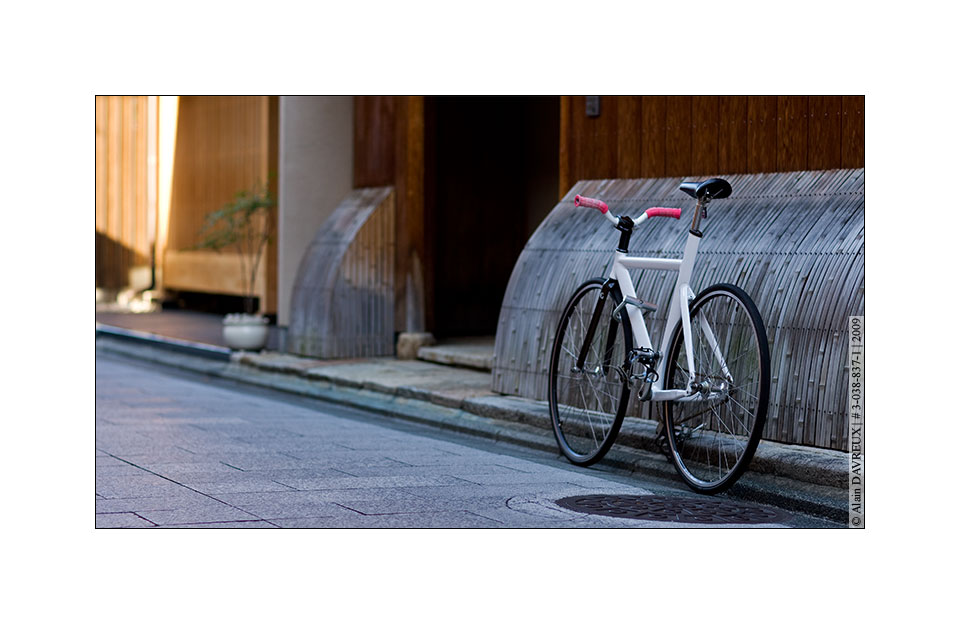 alainphoto | el muchacho > bienvenue un beau velo dans une ruelle pleine de maisons de the a kyoto ... mais je sais pas laquelle je prend, j ai rate la premiere avec le coup de soleil a gauche, et je trouve que la deuxieme n en dit pas assez si elle est presentee seule, et la geometrei n est pas parfaite pour info j ai eu tres peu de temps pour prendre ces cliches, le proprietaire est remonte dessus presque aussi vite qu il est arrive ...