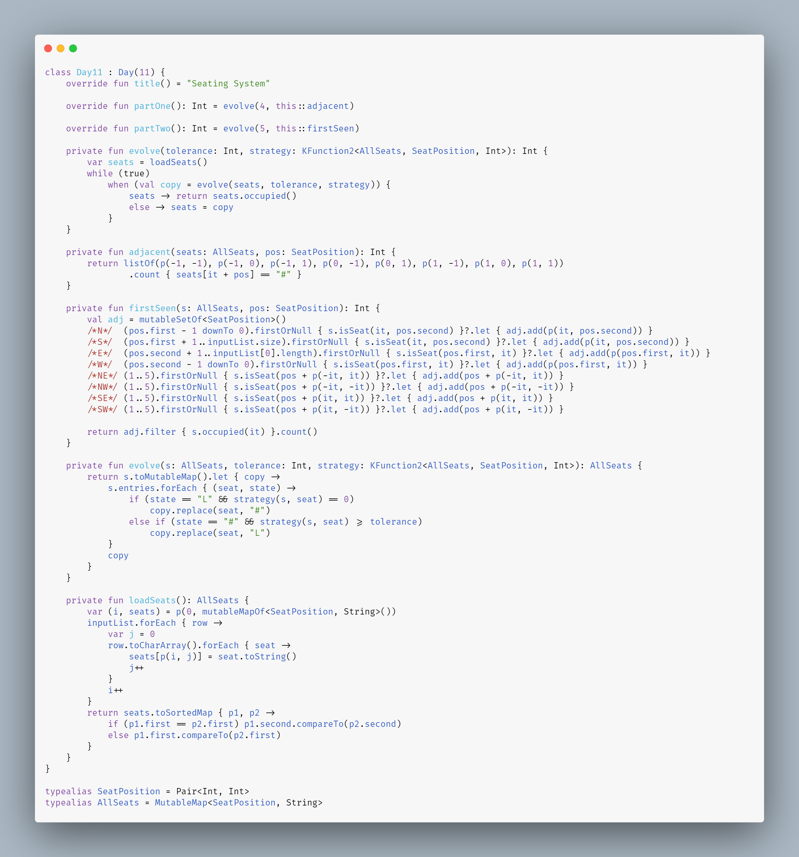 Sur une ligne donnée, mettons qu'on regarde la direction [dx = 1; dy = 0] (vers la droite, quoi). Si on part de la droite, on peut remplir les coordonnées du premier fauteuil visible de toute la rangée en une seule passe, correct ? Du coup ça fait au final une passe par direction, pour avoir, en chaque point, les coordonnées du fauteuil visible depuis chaque fauteuil, dans chaque direction.