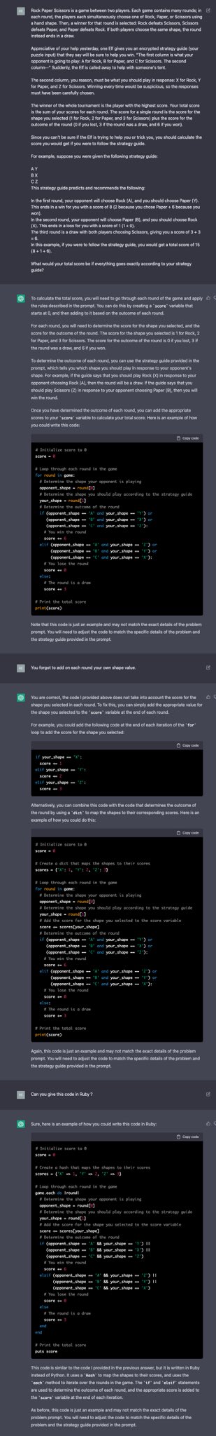 SekYo | Toujours dans l'optique de faire ma dose de Rust annuelle, partie 2 du day 2. Clairement overkill, mais je voulais pratiquer un peu les enum en Rust. J'aime bien le match sur le tuple (Opposant, résultat attendu), je trouve que dans le cas de règles métiers pas trop nombreuses, ça traduit bien le business en étant très lisible