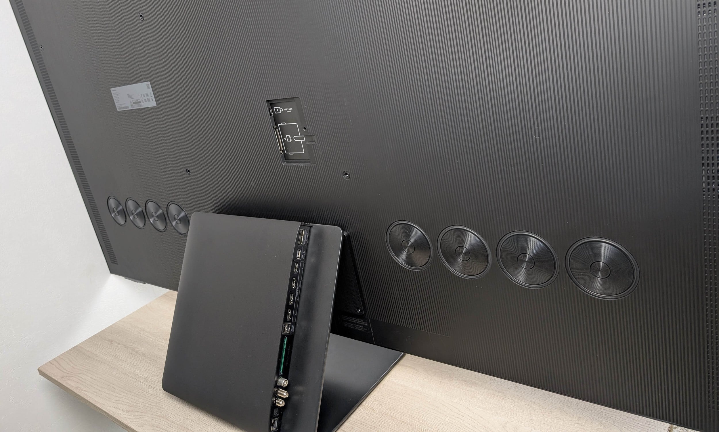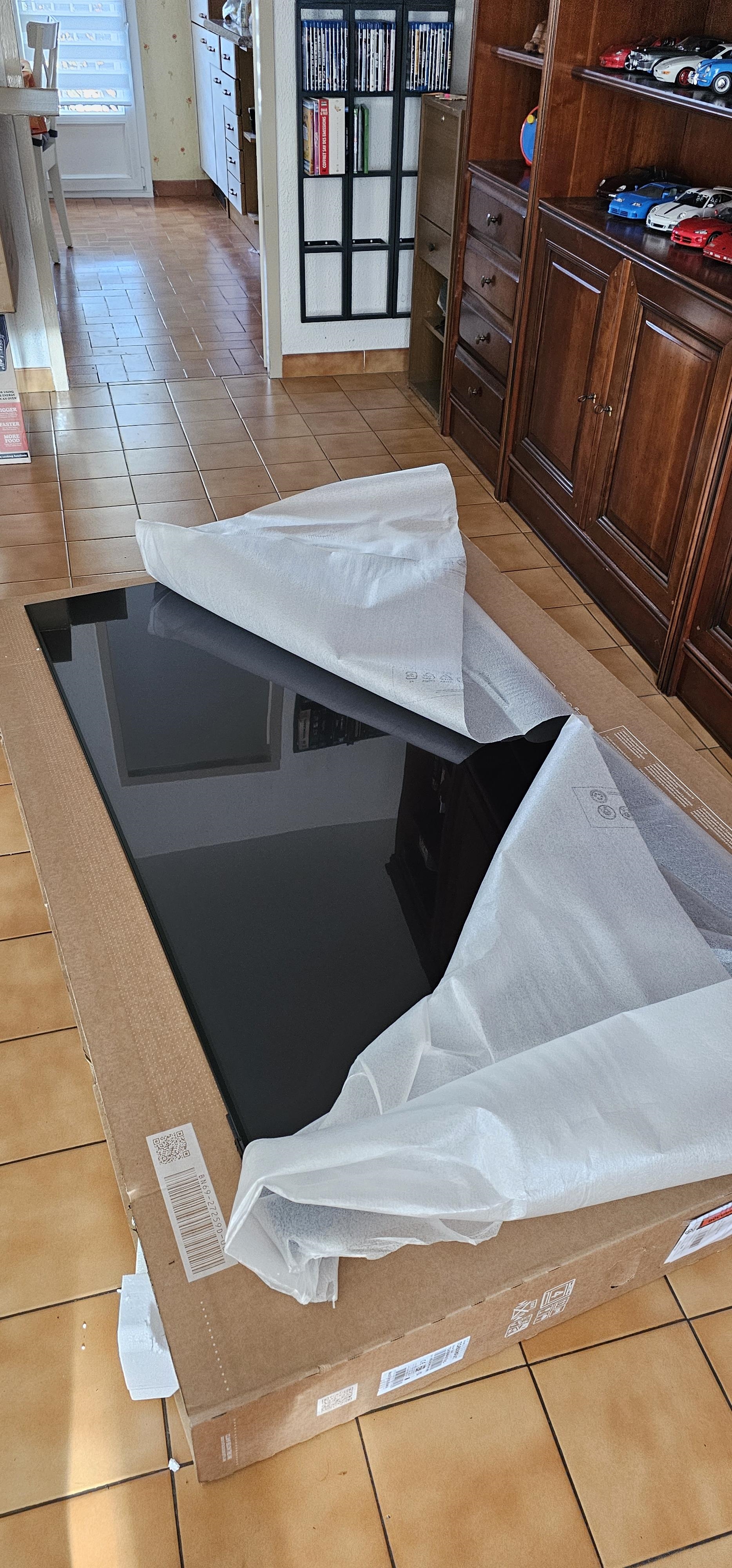 BON  Samsung S95F commandée, reçue et installée  Je l'ai prise en 65" (pour remplacer ma Philips 55" HS, cf mes derniers posts) et commente dire ... https://rehost.diberie.com/Uploads/ [...] .2.pic.gif Sans faire mon PP Garcia non plus, voici mon petit ressenti, si ça peut apporter des éléments de réponse à certains  Hésitez pas à scroller si nécessaire  Achat & livraison : J'ai fait mon achat directement sur le Samsung Shop (j'avais des rewards à dépenser et ils proposent le 4xCB sans frais), avec livraison à domicile, offerte et exécutée par "Vert chez vous" ( ) Premier point qui m'a interpellé : la TV est apparue directement dans mon SmartThings sur mon smartphone Samsung Galaxy, en tant que commande en cours. J'avais donc accès au numéro de série, numéro de modèle et tout, dès le passage de commande. Je ne savais pas Samsung (ou plutôt le compte Samsung) aussi précis et loin dans la cohésion, j'ai apprécié. Le livreur est arrivé pile à l'heure dans le créneau, et est venu dans mon salon déposer le carton. Je lui ai explicitement demandé de ne PAS activer et installer la TV, mais il a tout de même insisté pour ouvrir le carton et procéder à la première étape, que Samsung préconise de faire à 2 (sortir le TV de son carton, le déposer sur un drap sur une table pour donner accès aux fixations du pied). https://rehost.diberie.com/Picture/Get/t/445742 Packaging : Là aussi, j'ai été impressionné. Le carton est assez ingénieux (si si) : il s'ouvre pas le bas offrant accès à la TV debout, et contient des renforts pour pouvoir être utilisé comme plan pour poser le téléviseur dessus, le temps de monter le pied. C'est bien protégé, plutôt classe et la TV est livrée avec une toute petite télécommande (radio, solaire + batterie, mais non rétro éclairée) Le pied de la TV est bien fourni dans le carton ( ), et pèse son poids ! Il est constitué de 3 pièces qu'il faut assembler ... et qui se rayent facilement (mais bon on s'en fout, c'est caché) ...  Le package contient la visserie nécessaire (mais pas d'outil), et de quoi fixer (et cacher) le boitier de connexion déporté au dos de la TV si nécessaire. Enfin la TV me paraissait bien brillante (cf la photo ci dessus), mais elle est livrée avec un film de protection à retirer, dévoilant en dessous sa dalle quasi matte, impressionnant ! Connexion : Le boitier de connexion d'ailleurs, est immense ! Il fait (au doigt mouillé) 30cm sur 30cm et dépasse donc de mon meuble TV  Il est par contre plutôt fin (moins de 3cm d'épaisseur) et embarque toute la connectique attendue au dos (1xSamsung TV, 1xRJ45, 4xHDMI, 2xUSB, 1xToslink, 3xAntenne...) et sur le côté droit (1xAC 220V). C'est pratique, mais comme tous les connecteurs ne sont pas du même côté, c'est pas évident à cacher ... posé sur un meuble TV clair, ça se verra direct  Comme le boitier peut être fixé au dos du téléviseur, Samsung livre 2 câbles de connexion différents : un "noir" court (pour usage au dos) et un "gris" bien plus long (pour usage déporté). Les câbles sont interchangeables donc ça signifie que le boitier est totalement indépendant de la TV, le câble n'est pas moulé à aucun des 2 côtés. D'ailleurs au dos de la TV, il n'y a que 2 ports : le port vers le boitier et un port USB de service Ca rend la TV particulièrement fine ! A mi chemin entre la partie "affichage" de ma Philips (moins de 3mm) et la partie "électronique" de ma Philips (qui doit faire dans les 3 cm). Mise en service : Là aussi, Samsung m'impressionne ! A la première mise en service, la TV affiche un wizard de mise en route. Il est possible de le suivre à la télécommande, ou en scannant un QR Code sur son smartphone. C'est la 2e option que j'ai choisie, et tout se passe dans SmartThings sur le smartphone, du choix de la langue au scan des chaines TNT, c'est parfaitement fluide et ça parait hyper bien intégré dans l'écosystème Samsung. On sort du wizard avec la TV fonctionnelle, connectée, sur une chaine de la TNT, et les principales fonctions actives (WiFi, Bluetooth, connexion barre de son, mode Jeu pour la console etc...) Ressenti image Pour le moment, la TV est posée sur mon meuble TV, à ~50cm du sol et à ~2m50 du canapé. A cette distance, c'est GRAND, on va devoir s'adapter un peu. On a pour le moment le réflexe de s'écraser au fond du canapé pour s'éloigner le plus possible. C'est exacerbé par la luminosité, extrême et franchement douloureuse dans certaines situations. J'ai rapidement du baissé la luminosité SDR et HDR à 20 sur 50, sinon c'est à peine tenable en pleine obscurité. Côté couleurs et contraste, de base la TV vient en mode "AI" tout automatique et sincèrement c'est pas dégueu. Les plus cinéphiles gerberont sur le Montion Control (activé d'office, bien planqué dans les menus) et la colorimétrie très très (très) flatteuse voire saturée. Mais moi j'aime bien, ça me correspond bien. Côté HDR, c'est teeeeeeeellement lumineux en effet, impossible de distinguer la moindre différence de rendu entre le même média en Dolby Vision sur ma Philips et en HDR10 sur la Samsung. Dans les 2 cas, on bronze sur le canapé ! Ressenti audio Sorti du carton "ça fait le job" on va dire. La TV emabrque 8 petits haut parleurs plats de 6~8 cm de diamètre. Ca assure des aigus et des medium assez puissants, mais pour la spatialisation et les basses, forcément, on repassera, logique. Ca tombe bien, j'avais déjà une barre de son Samsung, et la TV l'a reconnue direct, mais avec quelques limitations (voir ci-dessous) un poil frustrantes  Globalement une fois configuré, c'est plutôt homogène, j'ai l'impression que c'est moins dynamique qu'avec la Philips, mais il va falloir que je prenne le temps d'étalonner l'installation. En utilisant ma barre de son Samsung, j'ai la possibilité d'utiliser le mode audio Q-Symphony, qui utilise conjointement les HP de la TV et ceux de la barre de son (+ 