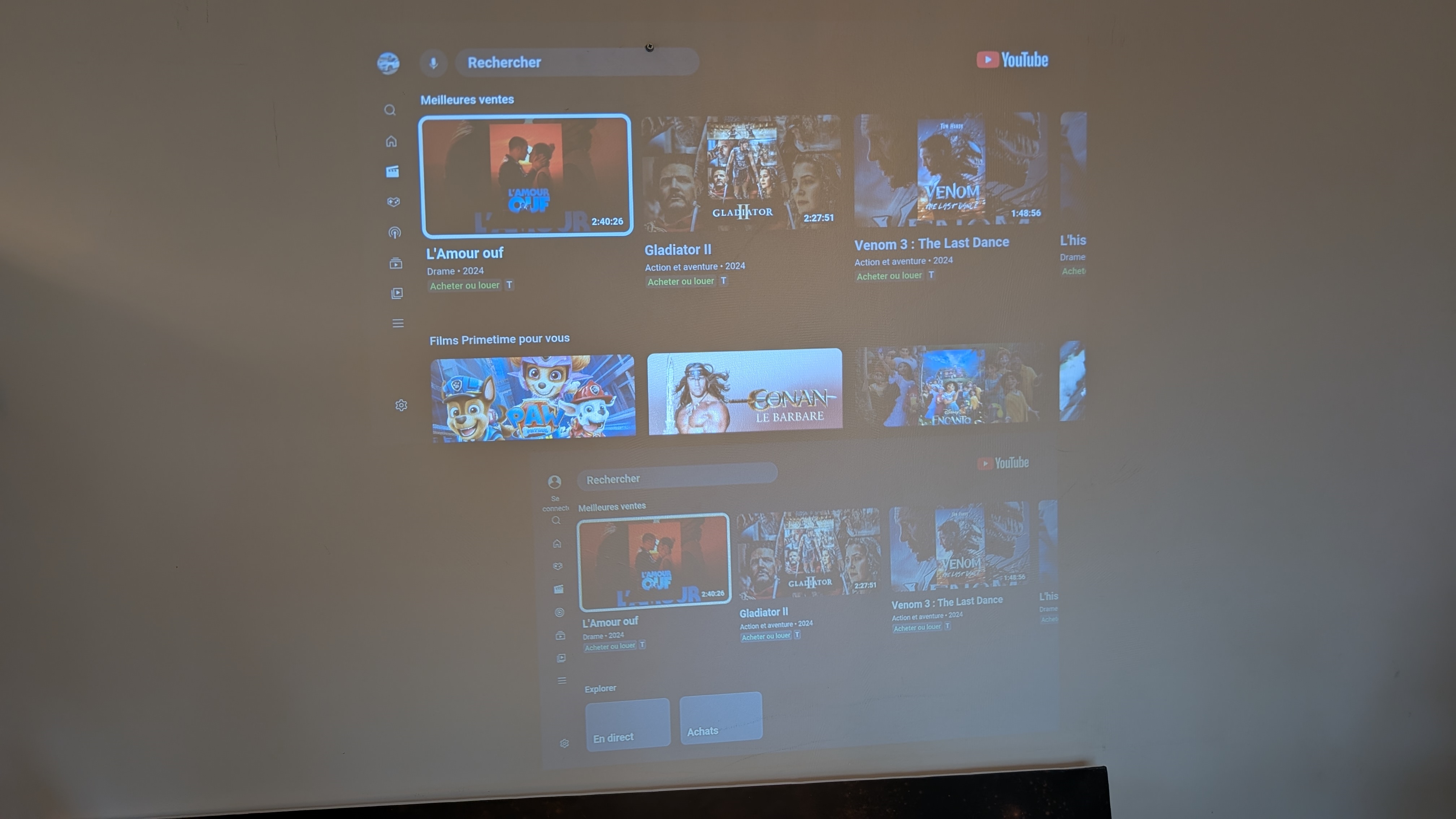 Reçu hier, la vache, les tests sur le internet ne mentent vraiment pas, je ne sais pas trop où on en est des projos chinois, mais pour un appareil qui m'est revenu à moins de 190€ frais de port inclus (et avec un casque BT d'assez bonne facture offert) c'est assez dingue... Mon précédent projo d'appoint date d'il y a une 10 aine d'années (150 fdp in), entièrement manuel/mécanique (focus, trapèze vertical), entrées hdmi, yuv, 720p et c'est tout, très bruyant, couleurs dégueulasses qui tirent sur le rouge (j'ai réussi à obtenir un truc acceptable après des heures de réglages), en gros, ça faisait l'affaire pour diffuser dehors sur un grand drap suspendu, manière de se faire une séance à la belle étoile (mais à condition qu'il fasse nuit noire). Là je me retrouve avec un truc entièrement automatique/motorisé (focus, trapèze vertical et horizontal, d'une efficacité étonnante, dès qu'on déplace l'appareil en cours de diffusion le réglage se refait automatiquement), entrées hdmi, 1080p, android TV, beaucoup plus silencieux, couleurs vraiment très belles sans aucun réglage, et j'ai pu diffuser dans le salon et dehors sur un rideau à l'arrache, le tout avec toutes lumières allumées, et un haut parleur (dont je n'ai aucune utilité) qui n'est pas trop mauvais Avec un écran correct et enfermé dans un meuble, je pense très sincèrement qu'il peut facilement remplacer un LCD FHD dans un salon, et pourtant j'ai un Bravia 75" 4K au quotidien. De toute façon pour moi ça reste de l'appoint (film à la belle étoile, match de x ou y sport à regarder entre potes dehors l'été, projection déco lors d'une soirée/fête), mais vraiment très étonné du GAP sur un bête produit chinois... Le seul défaut que je peux lui reprocher pour l'instant, c'est de n'avoir aucune protection de la lentille (mon autre projo à un capuchon en caoutchouc qui se met autour de la bague de réglage de la focale, ce nouveau n'a rien qui dépasse pour y mettre quoi que ce soit, il était livré avec un bête bout de plastique transparent inséré dans le trou Édit : juste pour illustrer, à l'arrache sur un coin de mur en plein jour (Source sur le vieux : Firestick tv 4k max) Message édité par Ecco le 04-05-2025 à 21:44:07 --------------- Afols, rejoignez nous sur #Lego sur irc.yozora-irc.net |