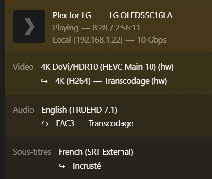 bobby8921 | J'essaye de lire une vidéo 4K avec l'appli Plex de mon LG C1 (j'ai le Plex Pass) mais impossible, ça rame régulièrement.