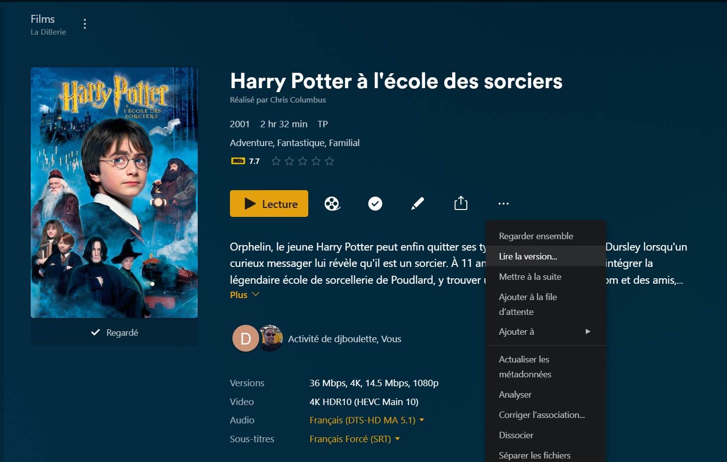 DiB91 Bwaaaaaaah | Pour moi, c'est la cascade des 2 : 1- la TV n'a pas les moyens de lire en direct le flux HEVC du fichier produit par l'iPhone, donc elle impose au serveur Plex de faire un transcodage (probablement HEVC --> H264) Solutions à envisager : Mini tuto rapide pour créer une version convertie dans Plex directement, parce que c'est planqué, on va pas se mentir : NB : la conversion peut prendre du temps ! Bien plus longtemps que la lecture x1 du film ! Message édité par DiB91 le 11-03-2026 à 12:09:44 --------------- La DiBerie | Rehost | Link |