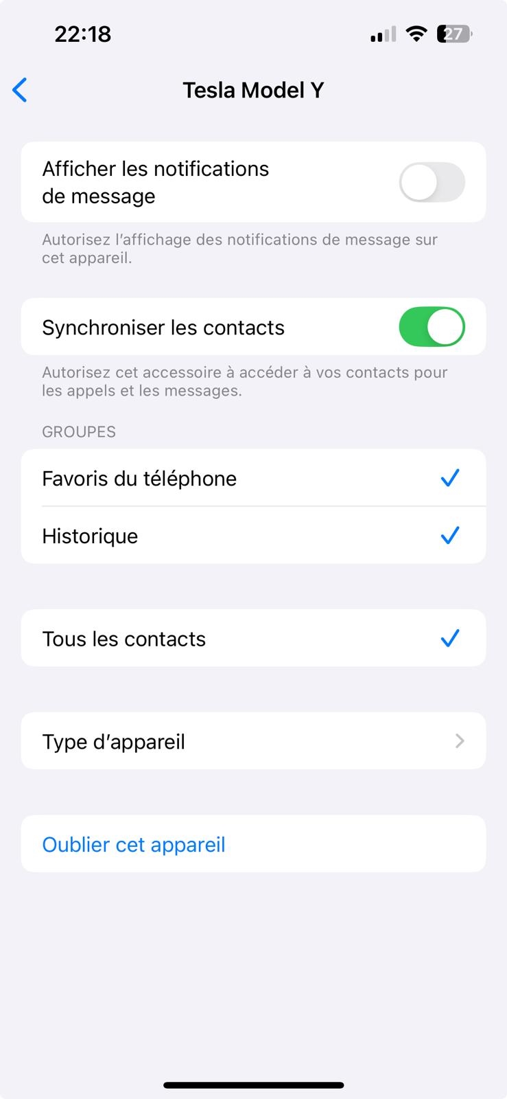 david42fr | Hello, L'un d'entre vous a-t-il déja eu des soucis d'association entre un iPhone (13 dans mon cas sour IOS 26) et une voiture? ça fait plusieurs fois sur que sur ma Tesla (2 modèles différents), la connexion se fait bien, je peux appeler et répondre mais il manque soit la partie favoris seule, soit la partie contact/favoris/journal d'appel. Quand je connecte le téléphone, l'écran sur l'iPhone, ce n'est pas l'écran habituel de connexon avec une voiture qui apparait. mon téléphone : Si je connecte le téléphone de mon épouse, ça fonctionne bien (même téléphone, même version). Redémarrage téléphone et voiture, oubli de la connexion, rien n'y fait Si ça vous parle? Message édité par david42fr le 15-10-2025 à 22:25:02 --------------- A life spent making mistakes is not only more honorable, but more useful than a life spent doing nothing. -- Shaw -- mon topic de vente photo |