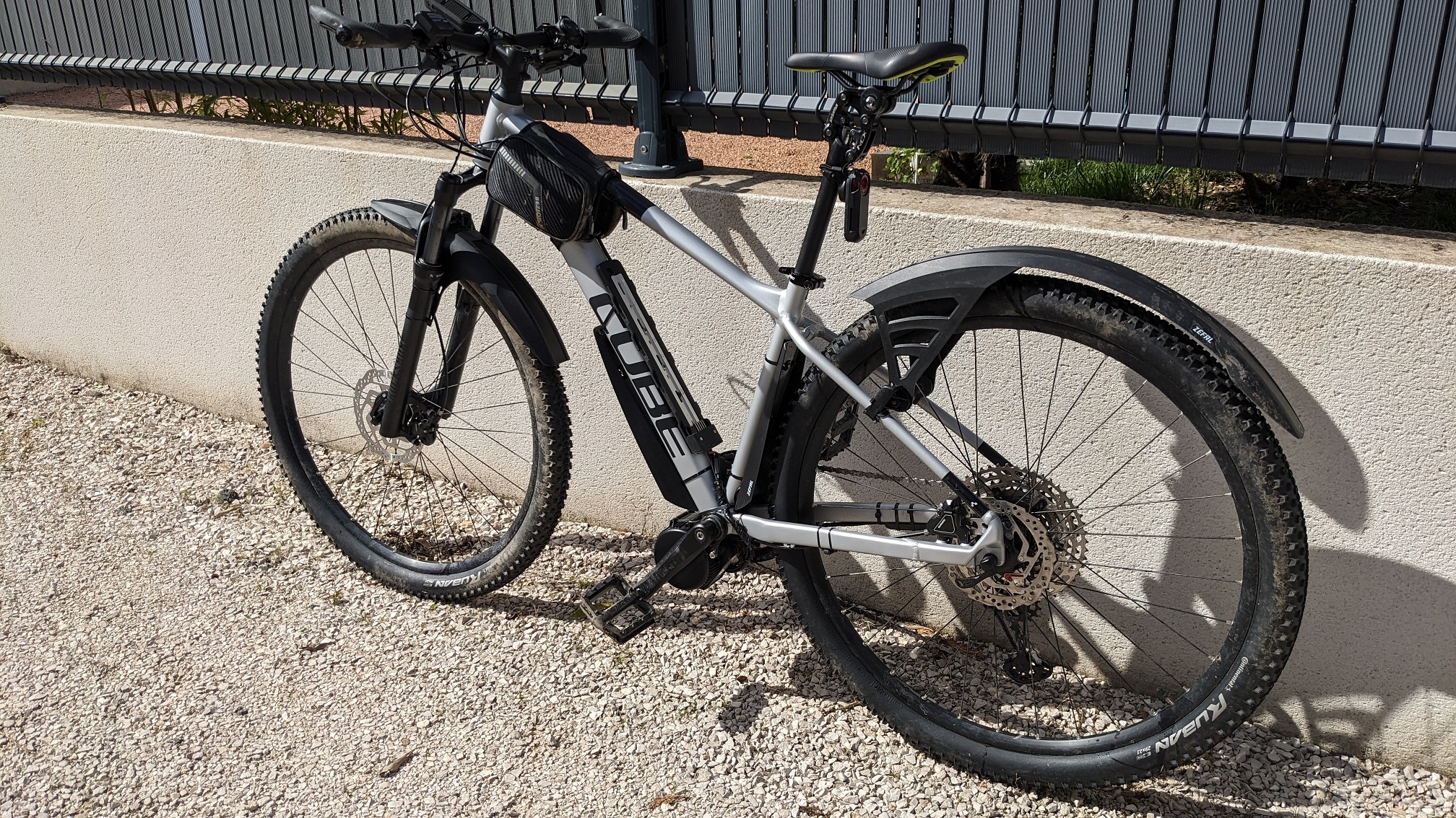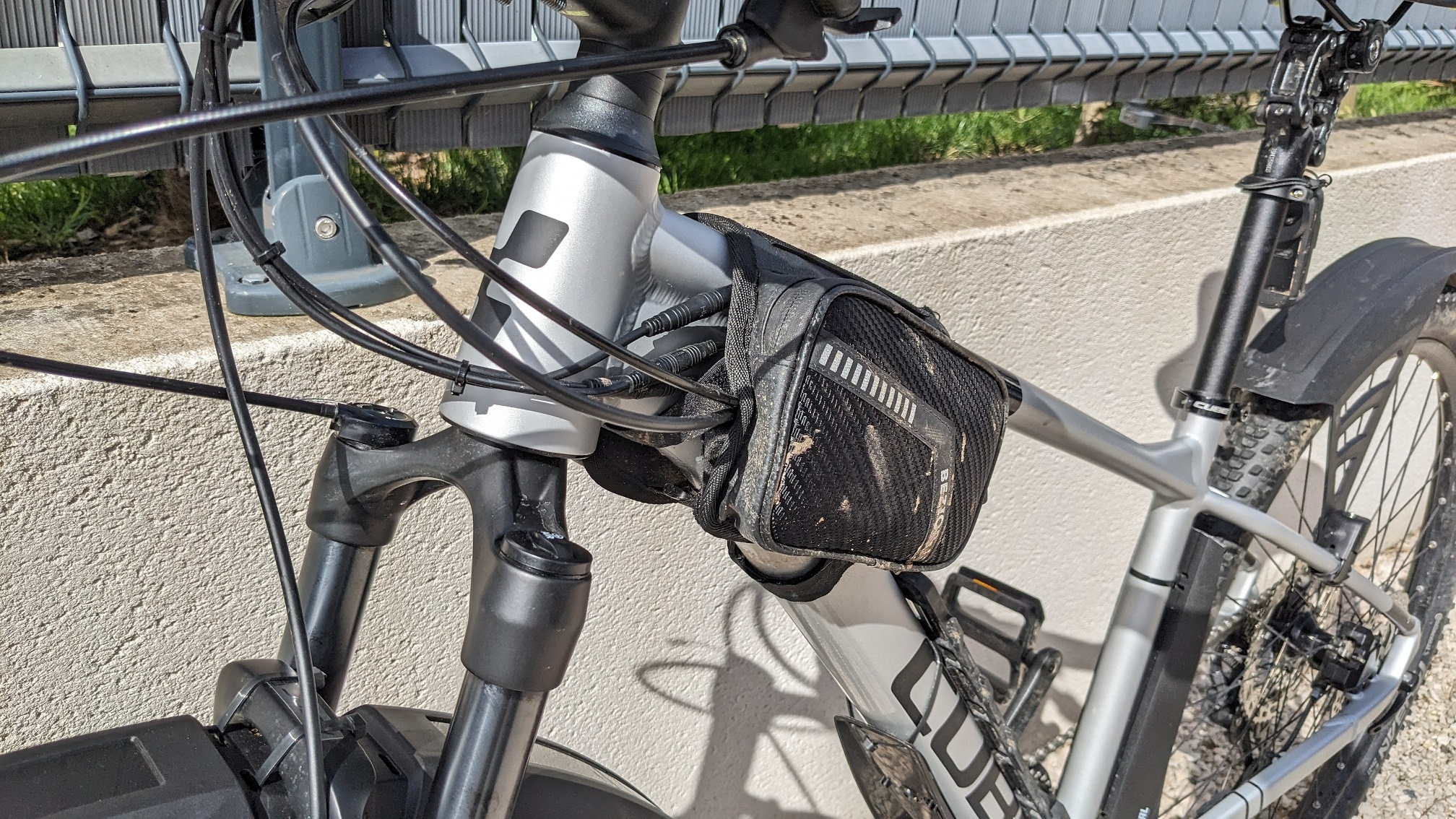 Je planque la nuée de câbles liés au moteur derrière la pochette de cadre qui me sert aussi à transporter tout le nécessaire de réparation. Lien : https://www.amazon.fr/dp/B097973MVH [...] E_SCE_dp_1