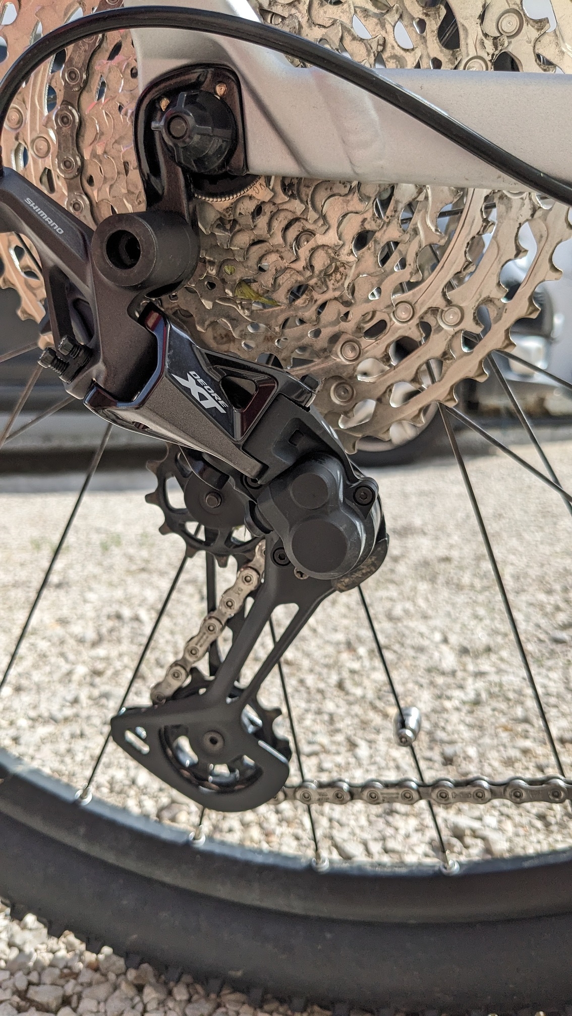 Le dérailleur Shimano de gamme XT RD-M8100-SGS avec fonction ShadowPlus anti-déraillement. Une horloge ce truc!