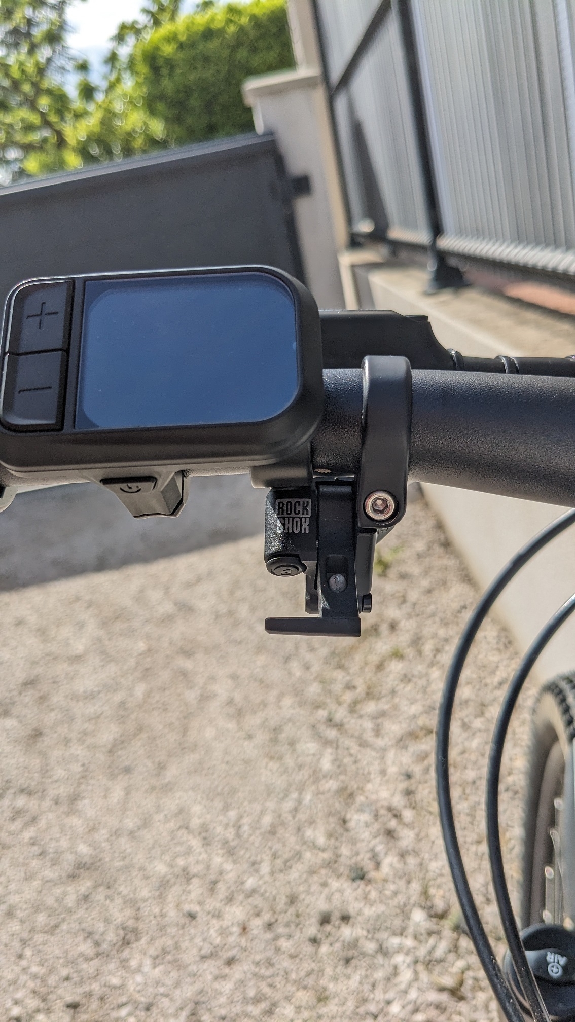 A gauche : Ozo 580C pour les commandes vitesse du moteur et l'affichage, et la commande de blocage de la fourche RockShox Judy Silver.