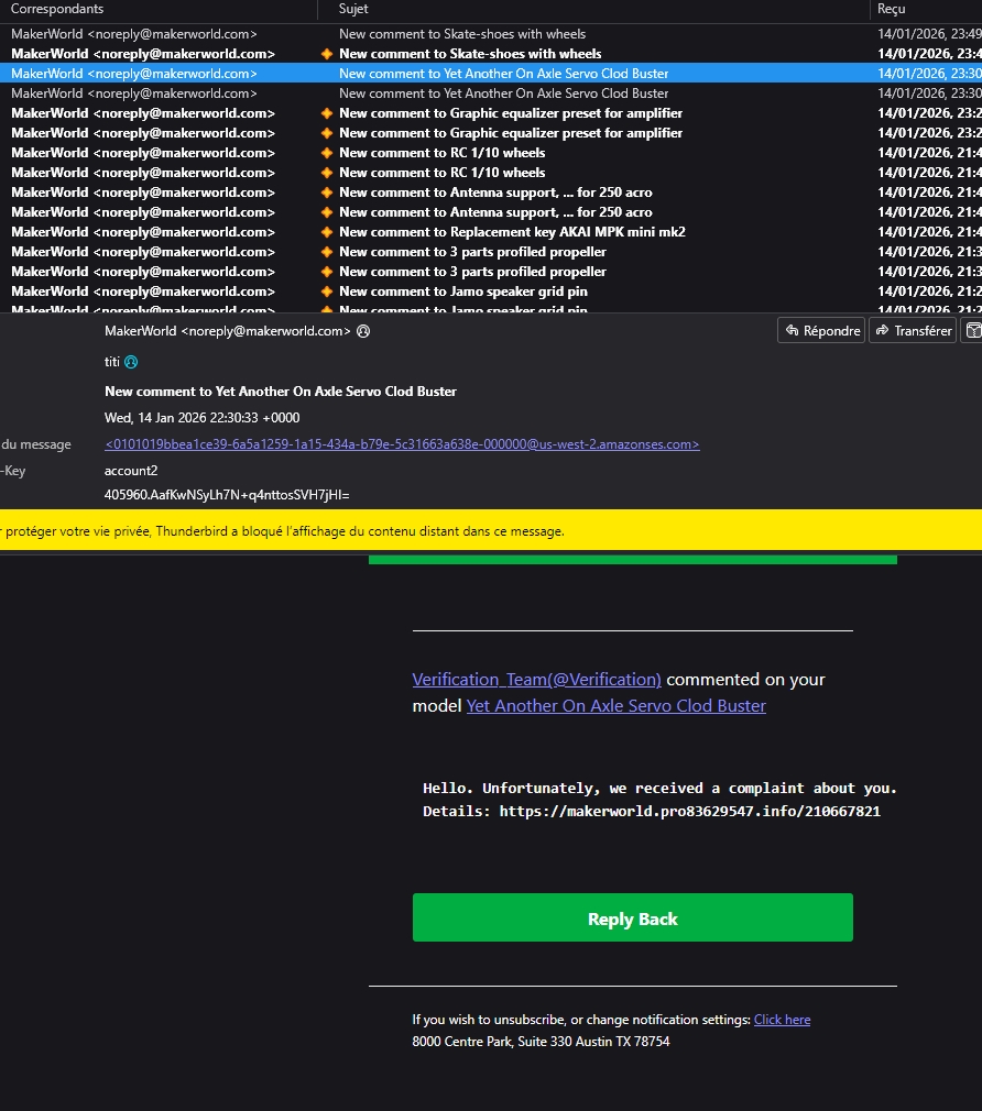 crazytiti http://crazytiti.free.fr/ | C'est normal que tous les modèles que j'ai re uploadé de printable / thingiverse vers makerworld ce soient pris un commentaire Ca ressemble fortement à du spam, le commentaire n'étant plus accessible, et le lien était le même sur tous, lien assez curieux vous en conviendrez. Moi qui croyais avoir attiré pleins de curieux Message édité par crazytiti le 15-01-2026 à 22:35:50 --------------- Le PC est une drogue... Mes modèles 3D qui me rapportent des points :-D https://makerworld.com/fr/@crazytiti https://www.printables.com/fr/@Crazytiti_1456354 |