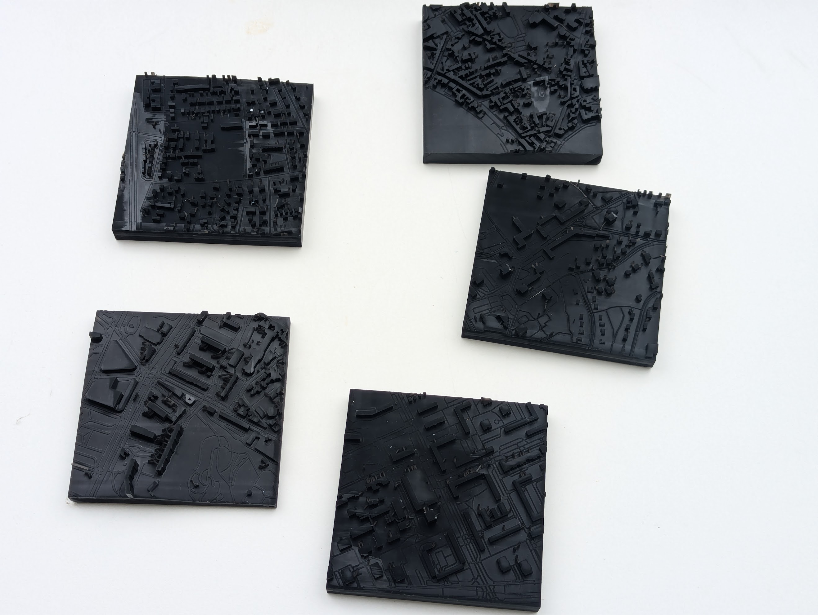 MycRub It was a trilogy | Pour les 50 ans de mariage de mes parents, les 5 villes dans lesquelles ils ont habité. Carrés de 700x700m à l'échelle 1:7000. Impression résine :