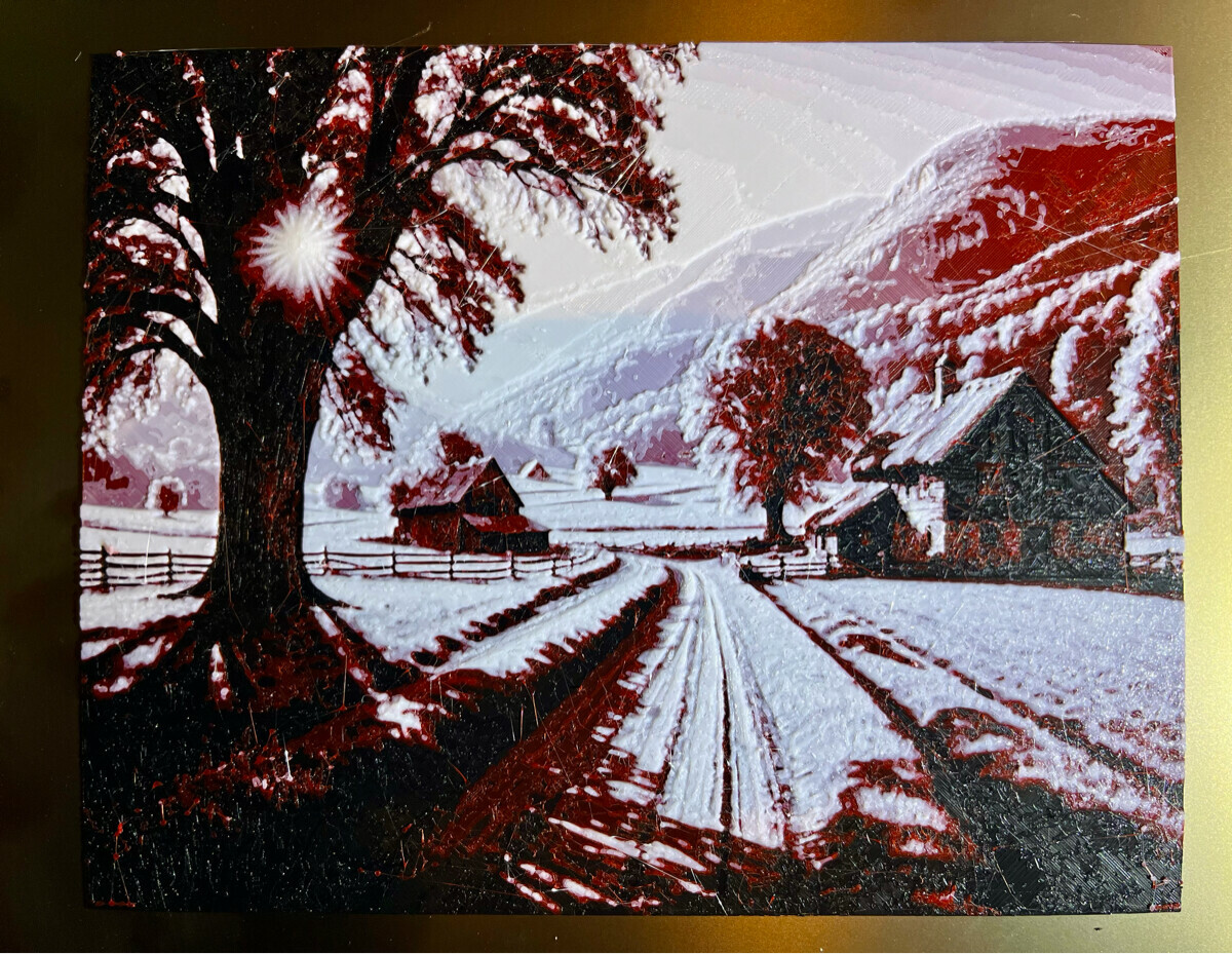 LibreArbitre La /root est longue | Il n'y a pas de technique particulière, il faut juste deux AMS. Ce modèle demande en effet 6 et 7 filaments (il y a deux variantes) mais à priori il serait possible d'obtenir un rendu similaire avec un seul AMS : Un noir mat et 2-3 blancs de TD différents, et à faire des retours dans les changements de couche. Il n'y a aucune limite du moment qu'on reste à 4 filaments Je n'ai pas beaucoup de temps en ce moment mais j'ai prévu de me servir de ce modèle pour mes tests (j'attends encore un 3e filament blanc aussi), si j'arrive à trouver l'image d'origine (pas certains qu'elle soit trouvable vu qu'il s'agit vraisemblablement d'une œuvre originale) Lien vers ce modèle : https://makerworld.com/en/models/13520#profileId-13260
