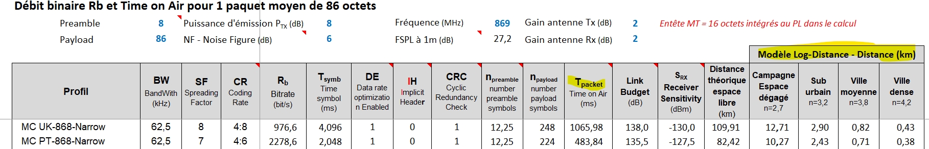 | Bersac | Ma comparaison théorique, je n'ai pas vérifié le ToA avec le calculateur Semtec qui était assez semblable pour les autres paramètres. La portée, c'est très estimatif comme toujours, les ondes radios font ce qu'elles veulent ; mais que fait donc la commission européenne :lol: https://rehost.diberie.com/Picture/Get/f/492255 |