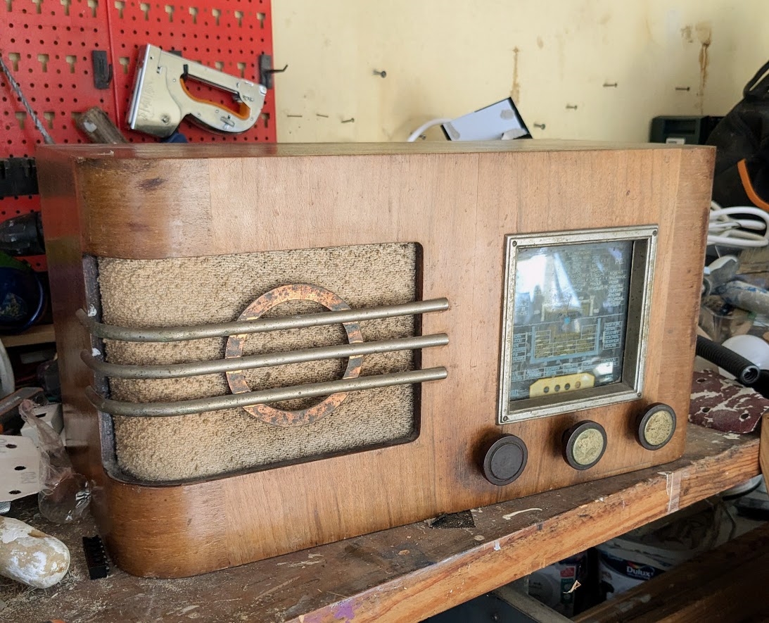 Oui elle est completement HS, lampes grillées/cassées, boutons qui tournent plus, l'aiguille qui indique la station est cassée etc. vu l'interieur full métal j'ai pas osé brancher la prise :D Rien que la forme est pas ouf entre le bois taché, les dorures oxydées, la feutrine moisie, sans parler d l'eletronique y'a déjà du boulot pour la remettre en état visuellement !