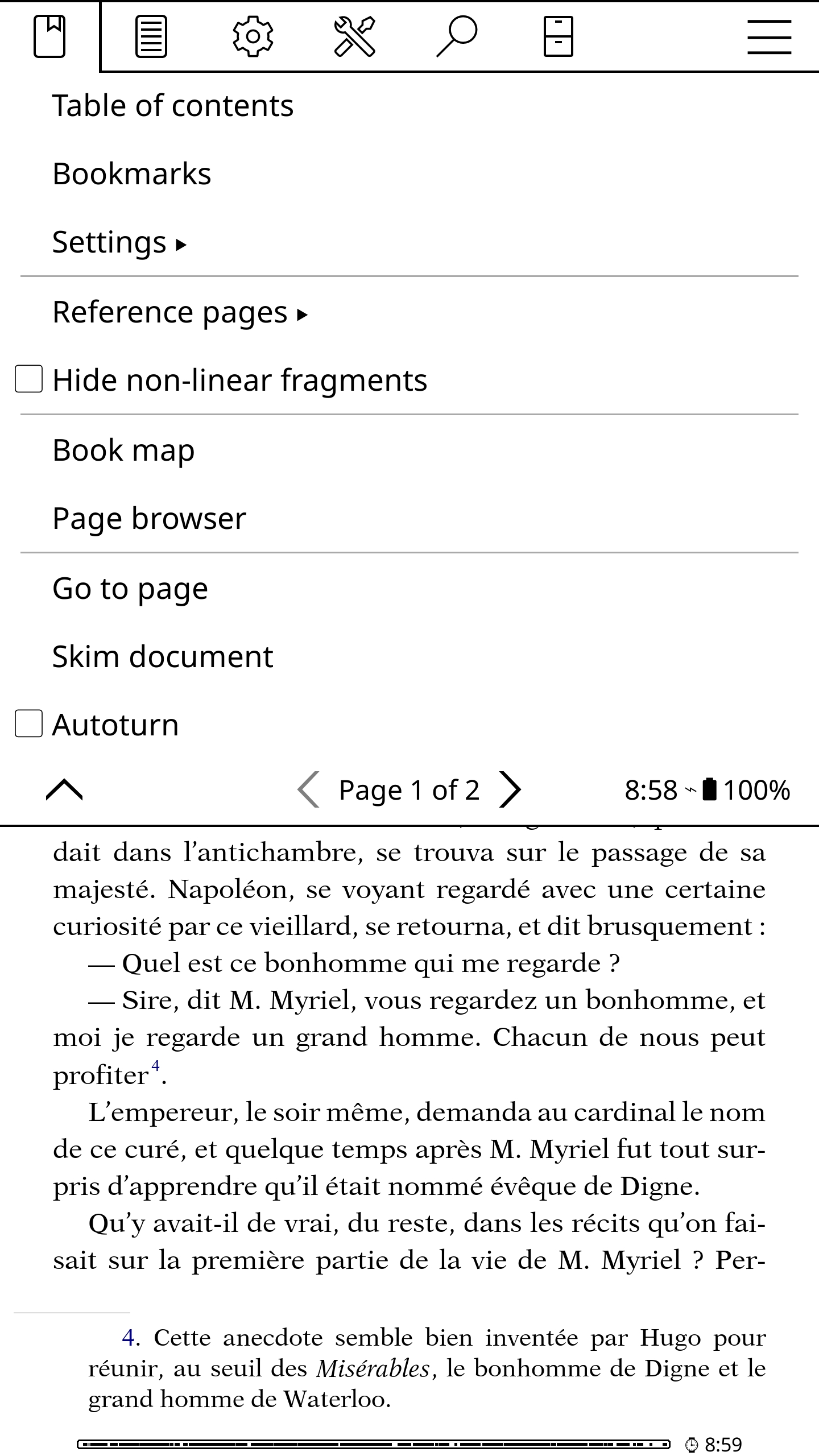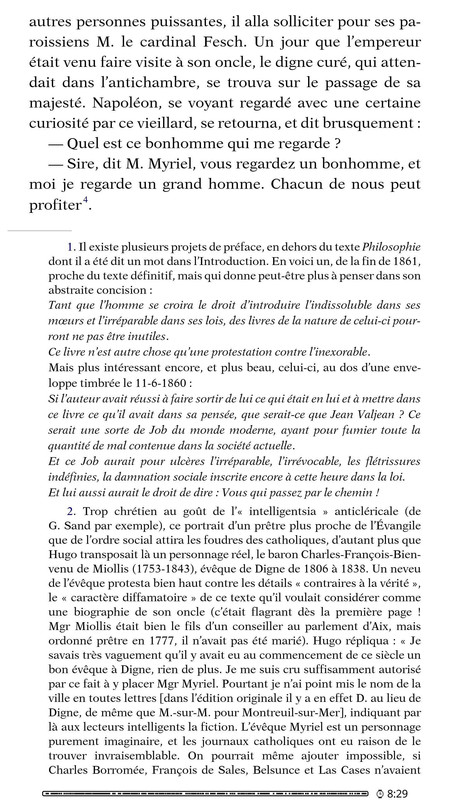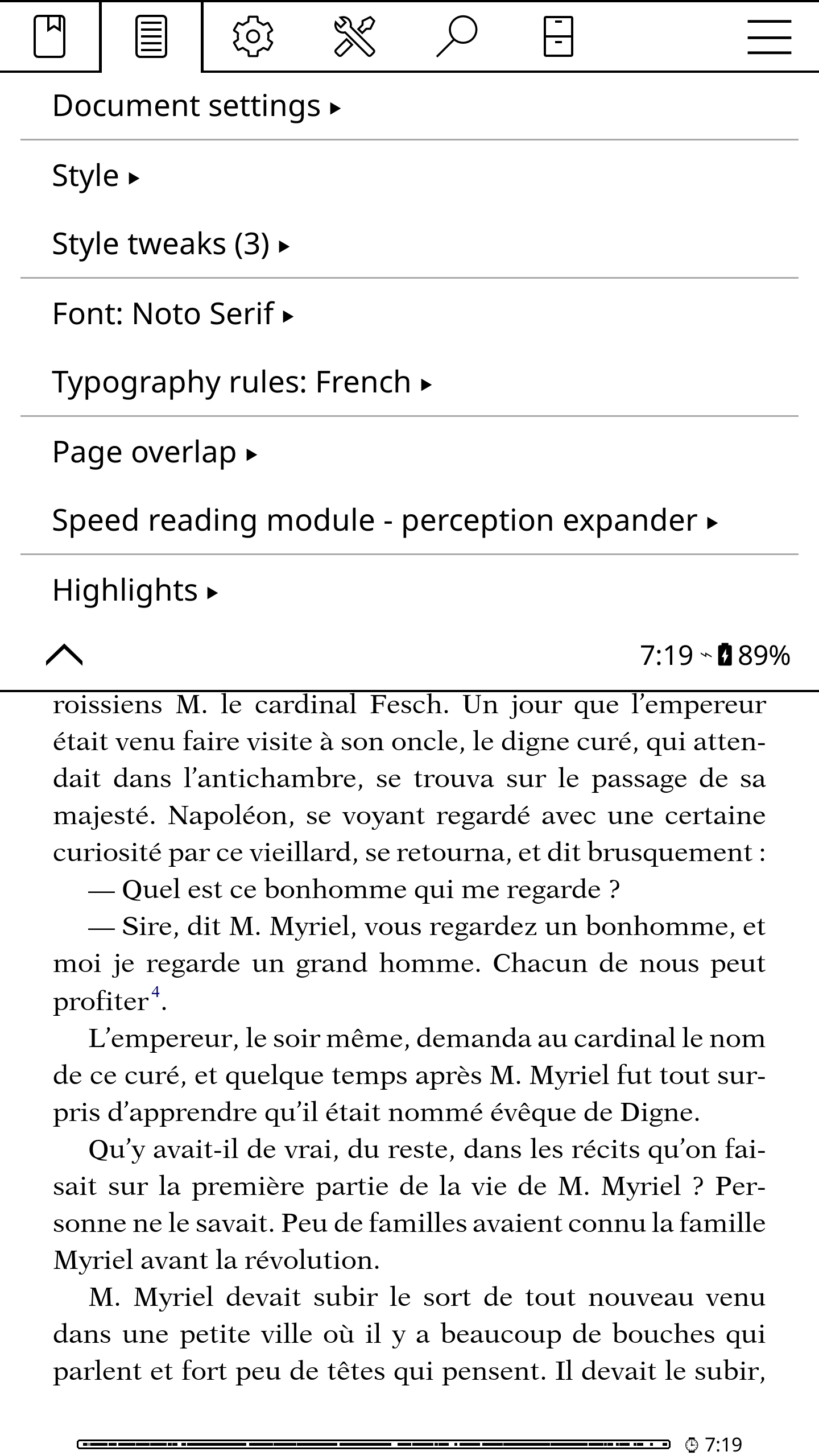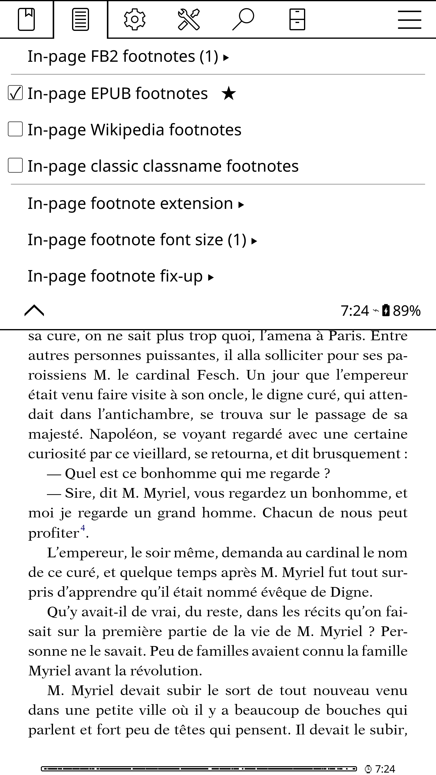 Leilu | Aujourd'hui, dans KOReader, nous allons voir comment afficher les notes de bas de page sur la page en cours. J'utiliserai KOreader sur mon téléphone avec les paramètres par défaut pour ne pas avoir à supprimer les paramètres KOReader de ma liseuse. Par défaut, pour la plupart des EPUB, pour afficher la note d'un passage ou d'un mot, il vous faudra appuyer sur l'exposant accolé à un mot. 1 - Appuyez sur le haut de l'écran pour afficher le menu du haut de KOReader. Appuyez sur le deuxième onglet en partant de la gauche. On a maintenant les notes de bas de page sur la page en cours. Plus d'aller-retour entre la page en cours et la fin du livre. Plus d'appui avec vos gros doigts à côté du petit numéro qui, au lieu d'ouvrir la note, change de page. * C'est pas fini ! Je vais maintenant vous montrer comment enlever toute la section des notes de bas de page à la fin du livre et ainsi récupérer une estimation de lecture plus proche de la réalité. Certains livres ont des pages et des pages de notes bien pénibles à tourner à chaque fin de chapitre ou comme ici à la fin du livre. Imaginez le bordel dans une édition avec appareil critique et des notes tous les deux mots comme l'édition critique de Mein Kampf « Historiciser le mal ». Voilà. Je vous invite à regarder et à tester les autres options du menu du haut concernant les notes de bas de page. Maintenant vous savez même vous débrouiller seul pour lire les descriptions de chaque option partout ailleurs dans KOReader. Message édité par Leilu le 29-09-2025 à 00:07:51 --------------- Expert PAKRAM sur MOS 32 H-track en bibande PADIRAC | Logiciels utiles |