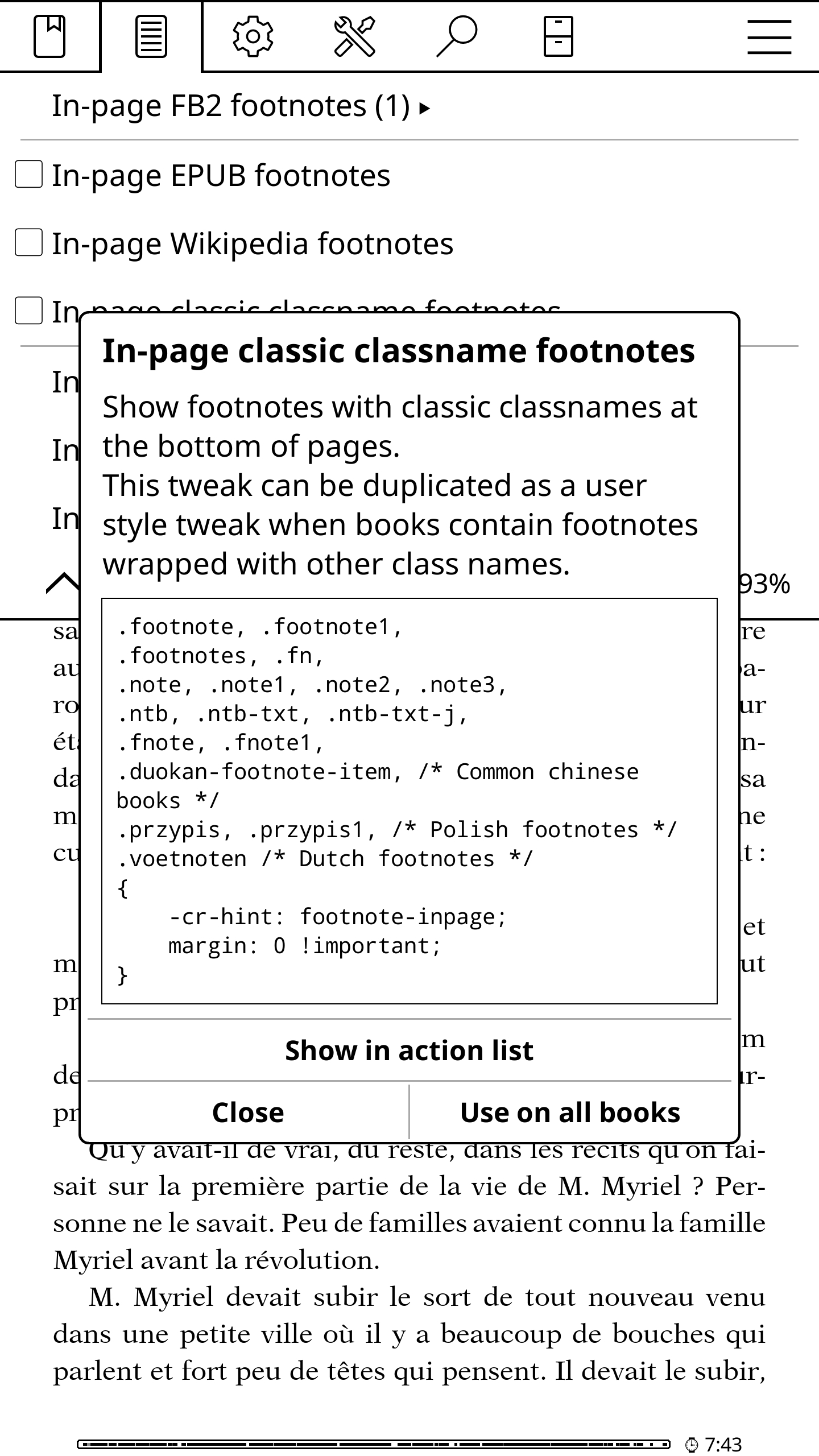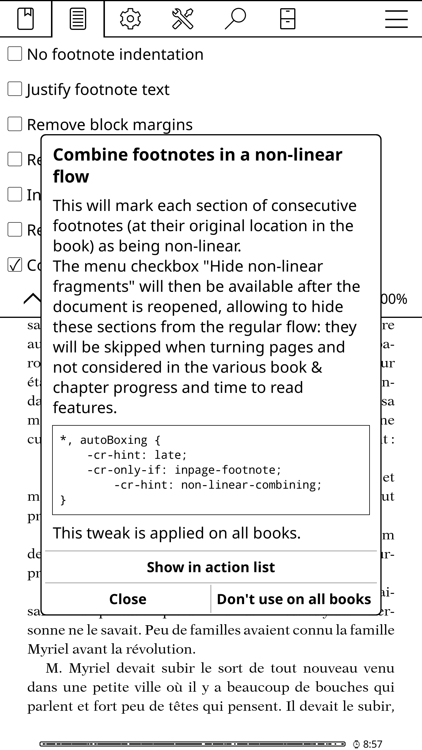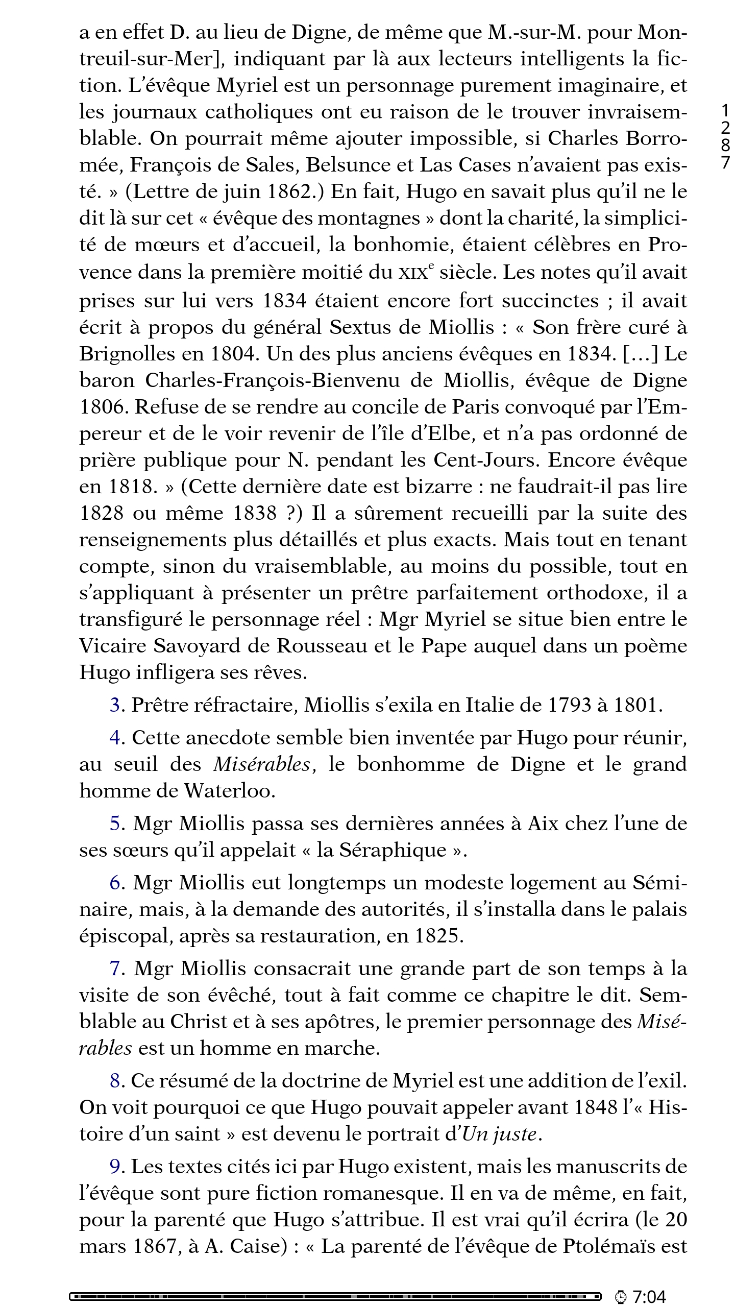 Leilu | Aujourd'hui, dans KOReader, nous allons voir comment afficher les notes de bas de page sur la page en cours. J'utiliserai KOreader sur mon téléphone avec les paramètres par défaut pour ne pas avoir à supprimer les paramètres KOReader de ma liseuse. Par défaut, pour la plupart des EPUB, pour afficher la note d'un passage ou d'un mot, il vous faudra appuyer sur l'exposant accolé à un mot. 1 - Appuyez sur le haut de l'écran pour afficher le menu du haut de KOReader. Appuyez sur le deuxième onglet en partant de la gauche. On a maintenant les notes de bas de page sur la page en cours. Plus d'aller-retour entre la page en cours et la fin du livre. Plus d'appui avec vos gros doigts à côté du petit numéro qui, au lieu d'ouvrir la note, change de page. * C'est pas fini ! Je vais maintenant vous montrer comment enlever toute la section des notes de bas de page à la fin du livre et ainsi récupérer une estimation de lecture plus proche de la réalité. Certains livres ont des pages et des pages de notes bien pénibles à tourner à chaque fin de chapitre ou comme ici à la fin du livre. Imaginez le bordel dans une édition avec appareil critique et des notes tous les deux mots comme l'édition critique de Mein Kampf « Historiciser le mal ». Voilà. Je vous invite à regarder et à tester les autres options du menu du haut concernant les notes de bas de page. Maintenant vous savez même vous débrouiller seul pour lire les descriptions de chaque option partout ailleurs dans KOReader. Message édité par Leilu le 29-09-2025 à 00:07:51 --------------- Expert PAKRAM sur MOS 32 H-track en bibande PADIRAC | Logiciels utiles |