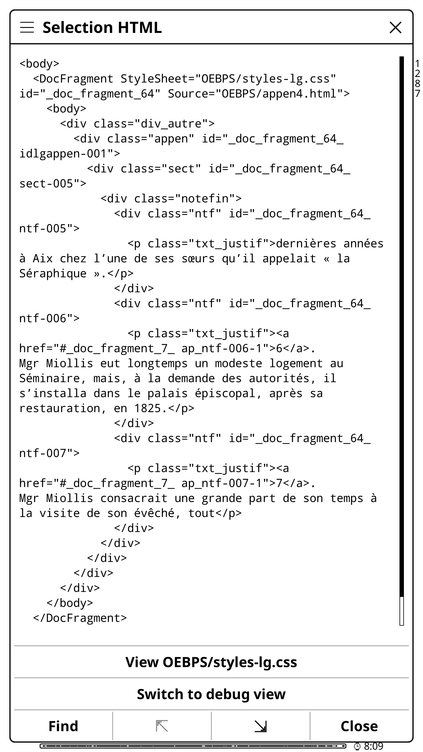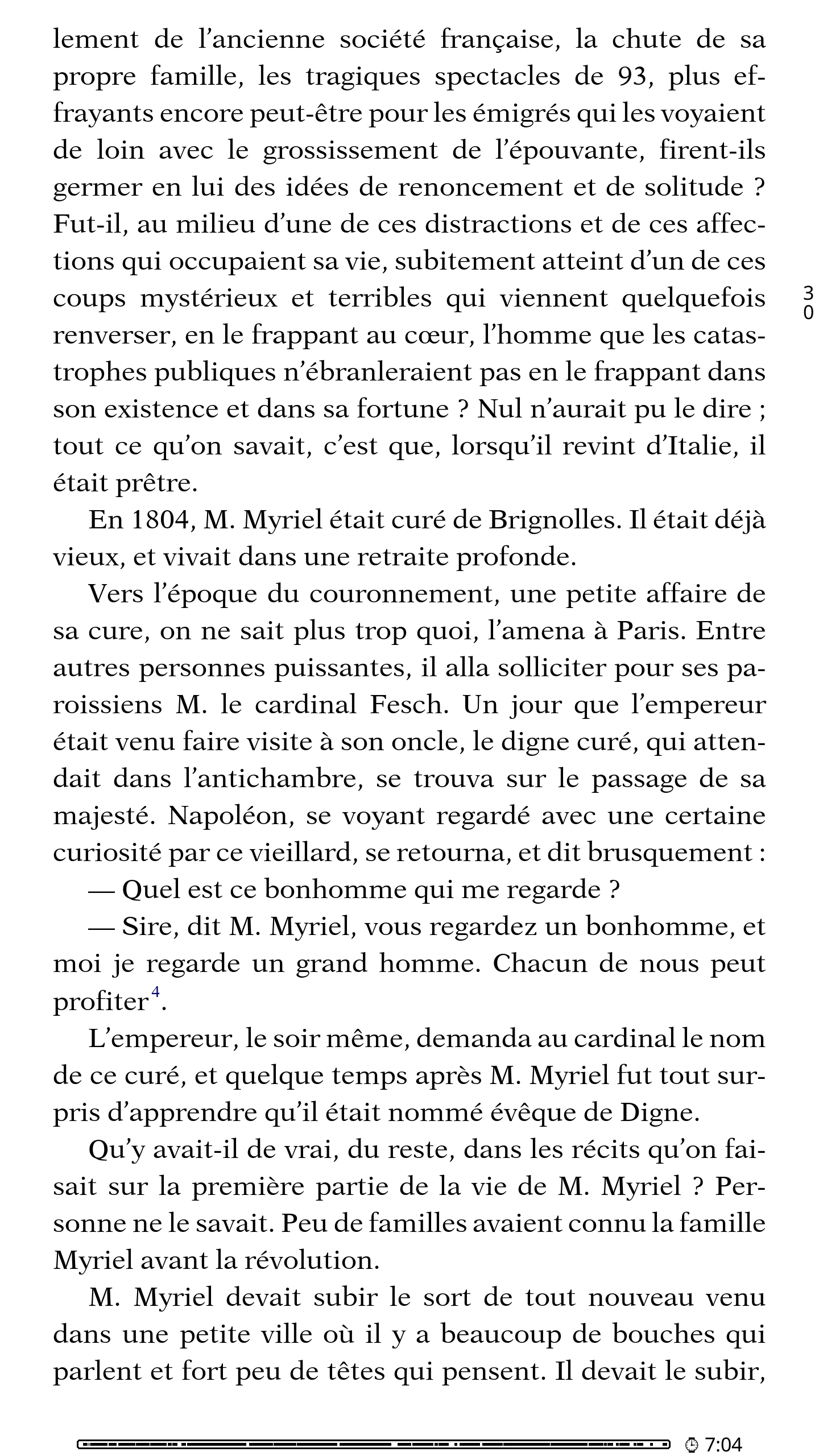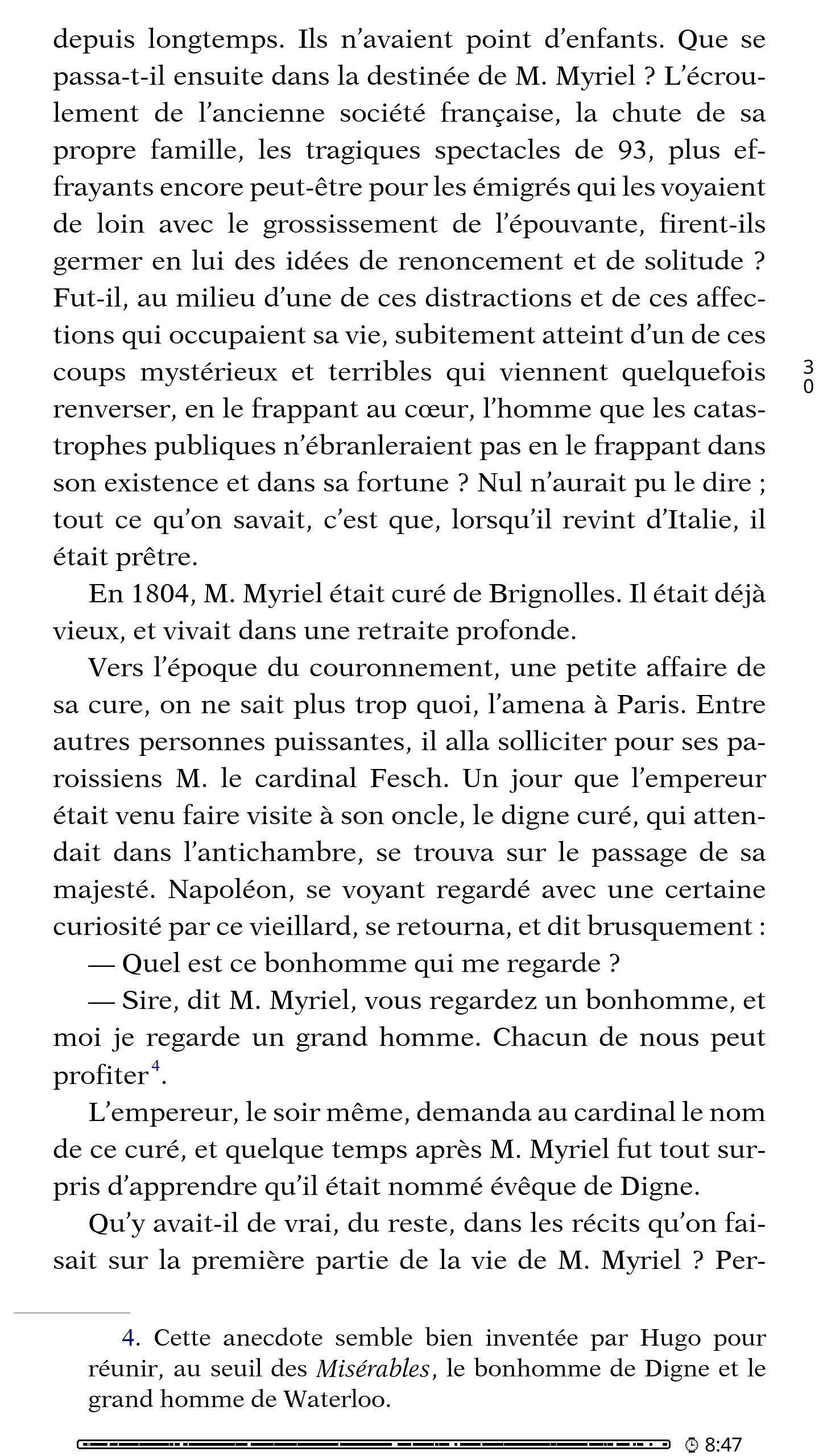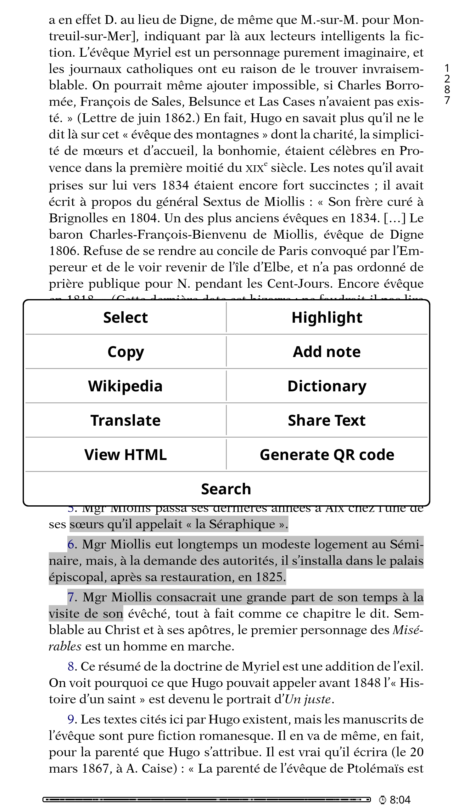 Leilu | Aujourd'hui, dans KOReader, nous allons voir comment afficher les notes de bas de page sur la page en cours. J'utiliserai KOreader sur mon téléphone avec les paramètres par défaut pour ne pas avoir à supprimer les paramètres KOReader de ma liseuse. Par défaut, pour la plupart des EPUB, pour afficher la note d'un passage ou d'un mot, il vous faudra appuyer sur l'exposant accolé à un mot. 1 - Appuyez sur le haut de l'écran pour afficher le menu du haut de KOReader. Appuyez sur le deuxième onglet en partant de la gauche. On a maintenant les notes de bas de page sur la page en cours. Plus d'aller-retour entre la page en cours et la fin du livre. Plus d'appui avec vos gros doigts à côté du petit numéro qui, au lieu d'ouvrir la note, change de page. * C'est pas fini ! Je vais maintenant vous montrer comment enlever toute la section des notes de bas de page à la fin du livre et ainsi récupérer une estimation de lecture plus proche de la réalité. Certains livres ont des pages et des pages de notes bien pénibles à tourner à chaque fin de chapitre ou comme ici à la fin du livre. Imaginez le bordel dans une édition avec appareil critique et des notes tous les deux mots comme l'édition critique de Mein Kampf « Historiciser le mal ». Voilà. Je vous invite à regarder et à tester les autres options du menu du haut concernant les notes de bas de page. Maintenant vous savez même vous débrouiller seul pour lire les descriptions de chaque option partout ailleurs dans KOReader. Message édité par Leilu le 29-09-2025 à 00:07:51 --------------- Expert PAKRAM sur MOS 32 H-track en bibande PADIRAC | Logiciels utiles |