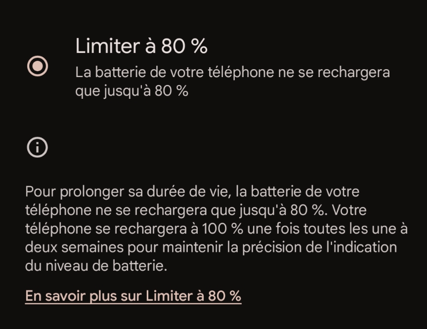 k0rnmuz3 | Il est précisé dans la doc que le téléphone peut ignorer cette limitation de temps à autres pour se recalibrer. Certains utilisateurs ont constaté que ça pouvait arriver plusieurs nuits/charges de suite avant de revenir à la normale. Message cité 1 fois Message édité par k0rnmuz3 le 26-03-2025 à 16:59:56 --------------- Lego à vendre : https://forum.hardware.fr/hfr/Achat [...] 4737_1.htm || Pixel 9 Pro Fold 256 Porcelaine à vendre : https://forum.hardware.fr/hfr/Achat [...] 7379_1.htm || Lian Li |