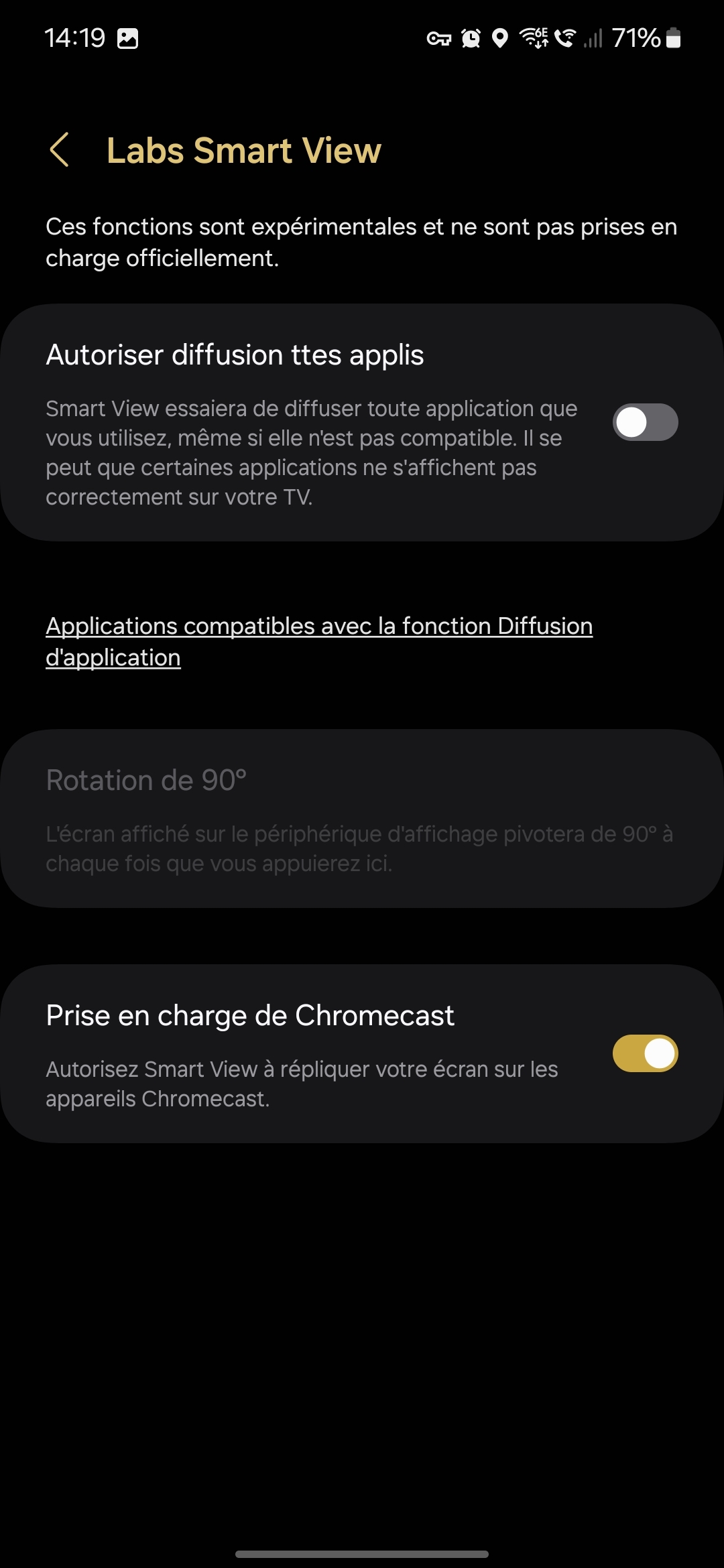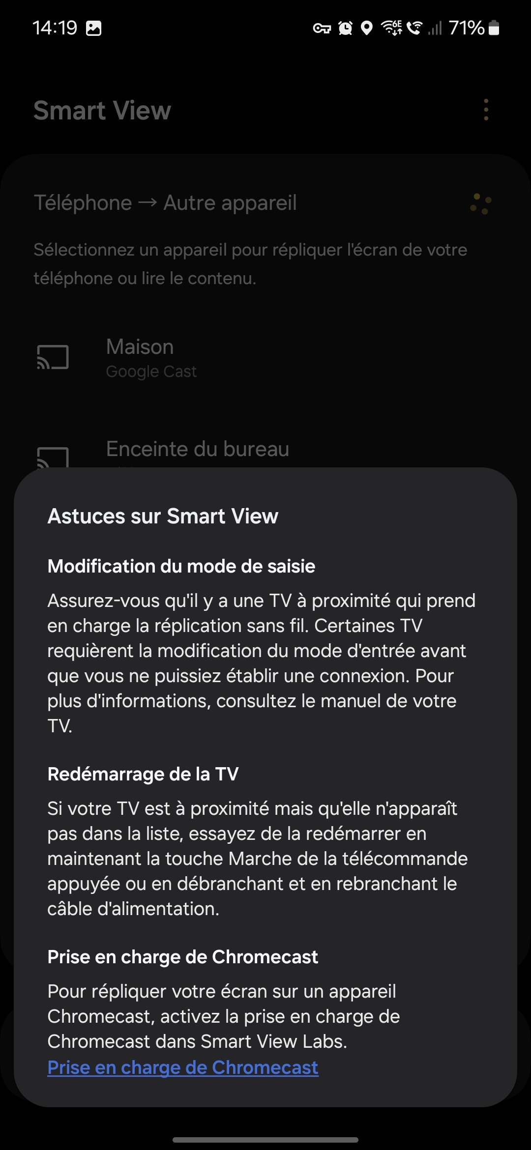 Quand tu lances Smart View -> "vous ne trouvez pas l'appareil" -> Prise en charge Chromecast -> Labs Smart View |