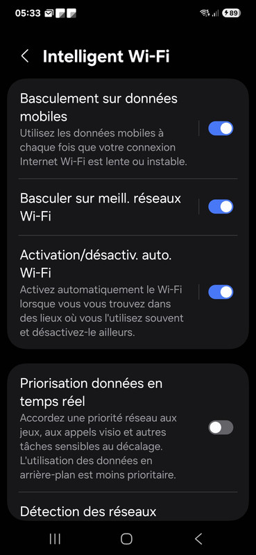 D'abord, il faut cliquer plusieurs fois sur "intelligent Wi-Fi". (je suis en v6 car je suis sur un S23U sous One UI 6.1) Et on a même, dans les options développeurs la qualité de notre Wi-Fi a un point spécifique, genre mon Wi-Fi en 2,4 Ghz et 5 Ghz se voit visuellement :