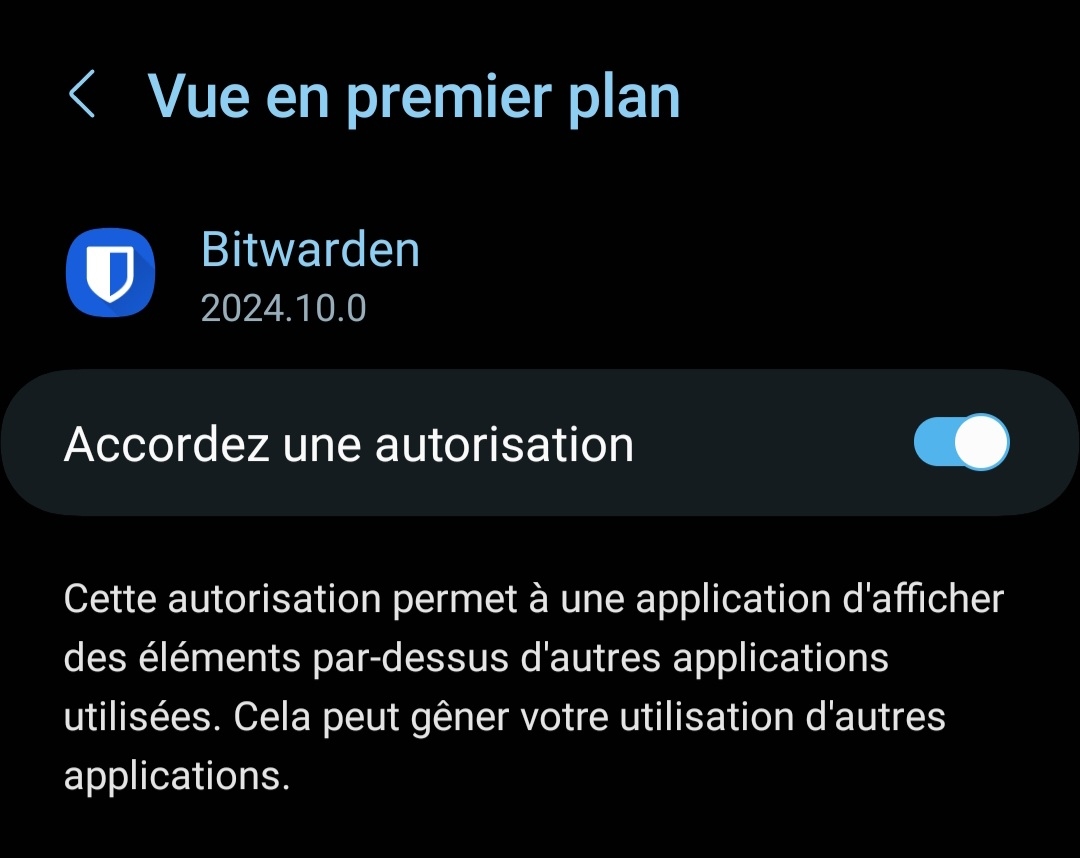gui3gui | Il faut peut être que bitwarden ait les droits d'appli superposée ? |