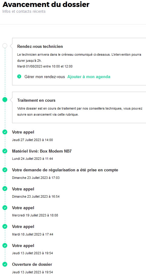 jln2 | Le technicien SFR à capuche est passé ce matin. Vous pouvez pas m'être sur votre fiche d'intervention "box HS à échanger" pour au moins m'aider pour que je rappel? Porte fermée, j'appelle de suite la hotline pour clôturer le dossier. Donc maintenant, en attente de la fameuse box 7, le colis est parti ce matin Message cité 1 fois Message édité par jln2 le 29-07-2023 à 13:39:10 |